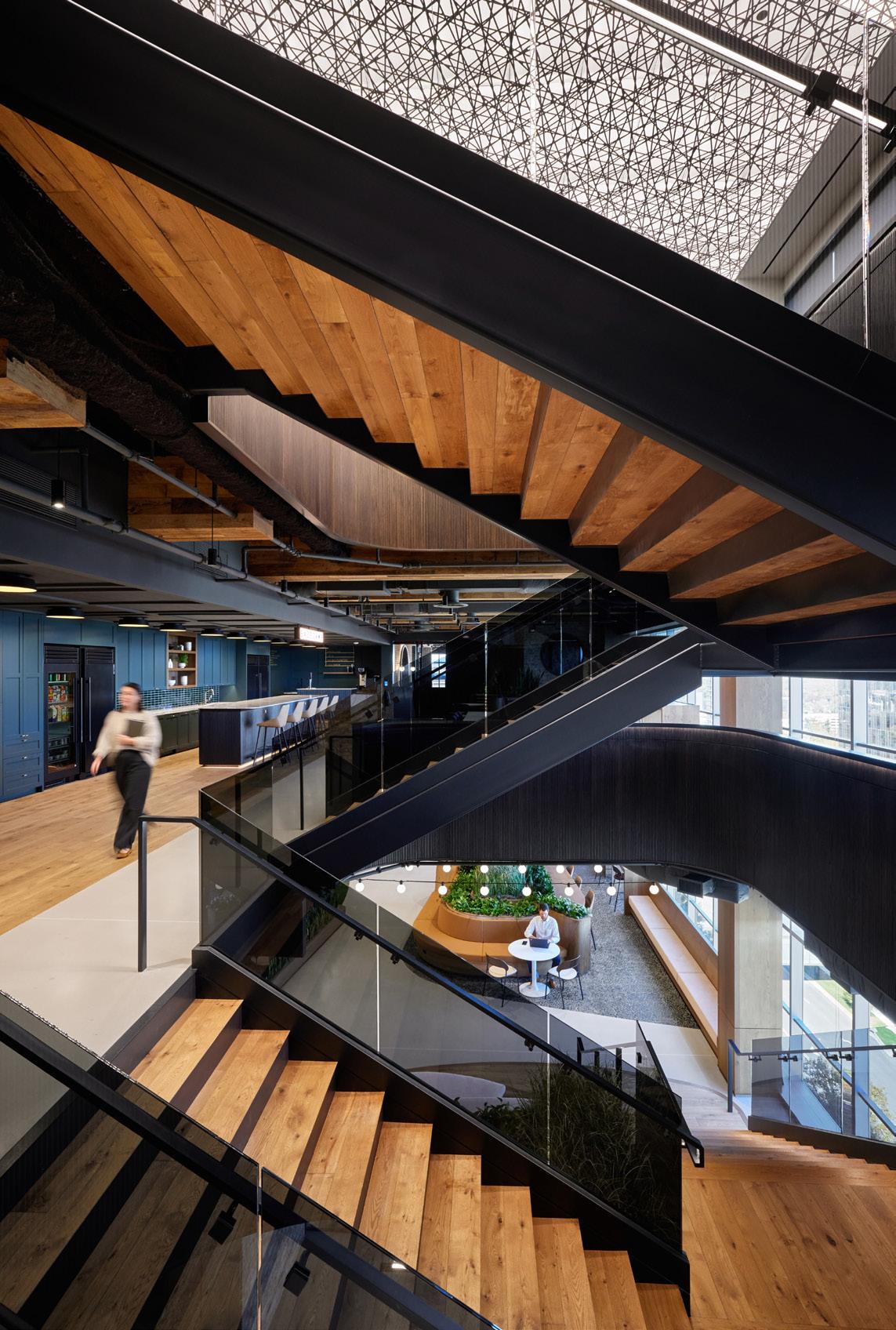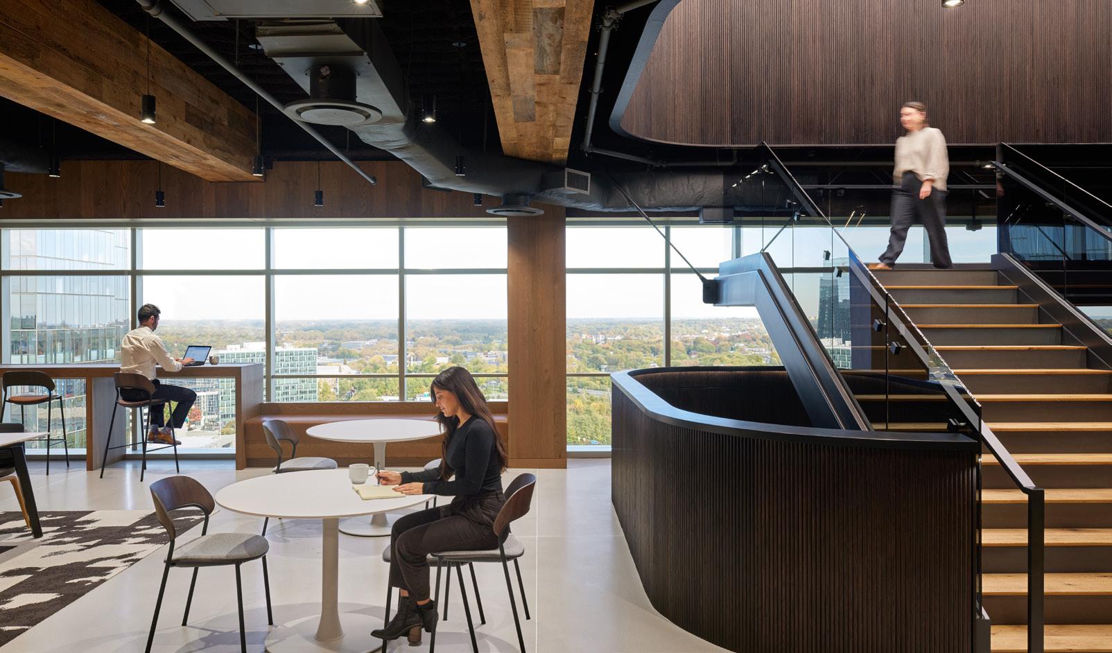 A multi-level HQ with a monumental internal stair re-imaged. We standardized spatial “neighborhoods” and blurred the thresholds in between. Design cues like cafés and lounges softens hybrid culture into place.