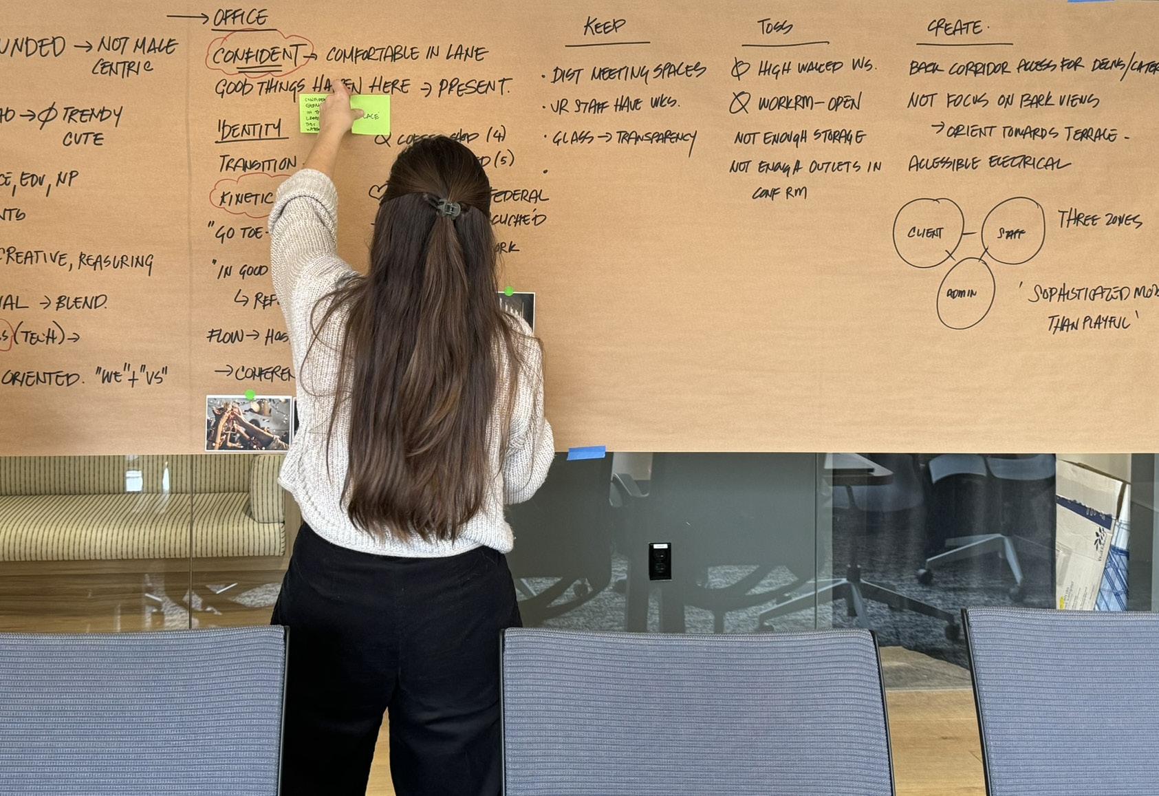 Leading a collaborative visioning session to align on look, feel, and design direction—gathering real-time feedback to ensure the concept reflects the client’s culture and goals.
