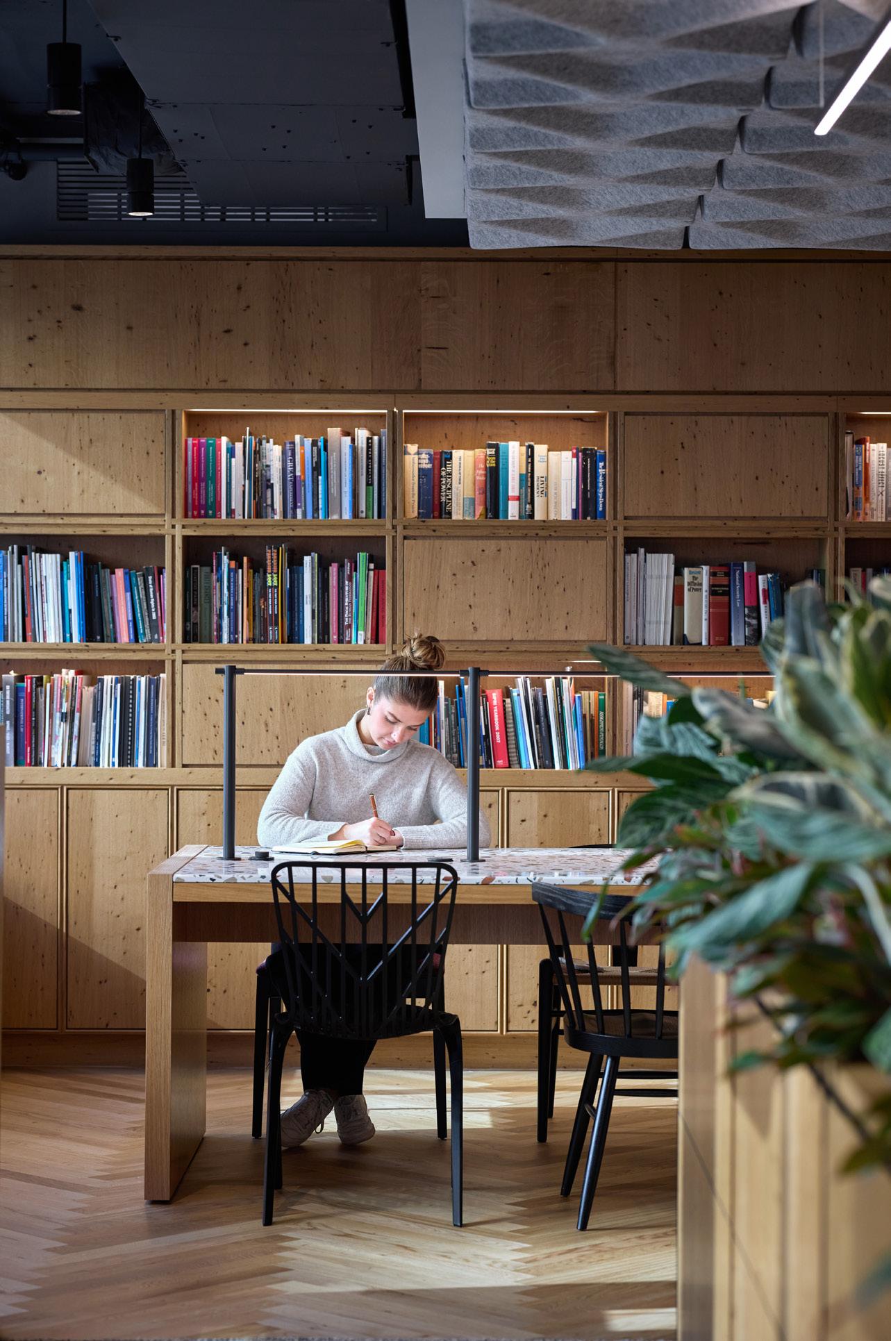 The incorporation of numerous library spaces, designed to accommodate an extensive collection of volumes, was also a significant programmatic requirement. The office design features standardized private offices equipped with ergonomic furniture and a timeless aesthetic.