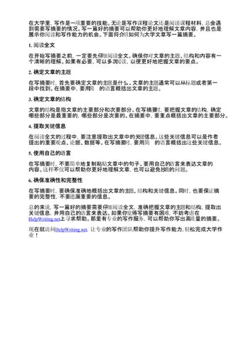 在大学里,写作是一项重要的技能。无论是写作课程论文还是阅读课程材料,总会遇 到需要写摘要的情况。写一篇好的摘要可以帮助你更好地理解文章内容,并且也是 展示你阅读和写作能力的机会。下面将介绍如何为大学文章写一篇摘要。