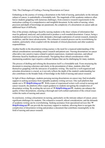 In light of these challenges, students pursuing nursing dissertations on cancer may find invaluable support in seeking assistance from reputable academic writing services. One such platform that stands out is ⇒ HelpWriting.net⇔. With a team of experienced writers well-versed in nursing and cancer research, the platform offers expert guidance to students navigating the complexities of dissertation writing. By availing the services of ⇒ HelpWriting.net⇔, students can enhance the quality of their dissertations, ensuring a thorough and well-crafted exploration of the critical issues within the realm of nursing and cancer.