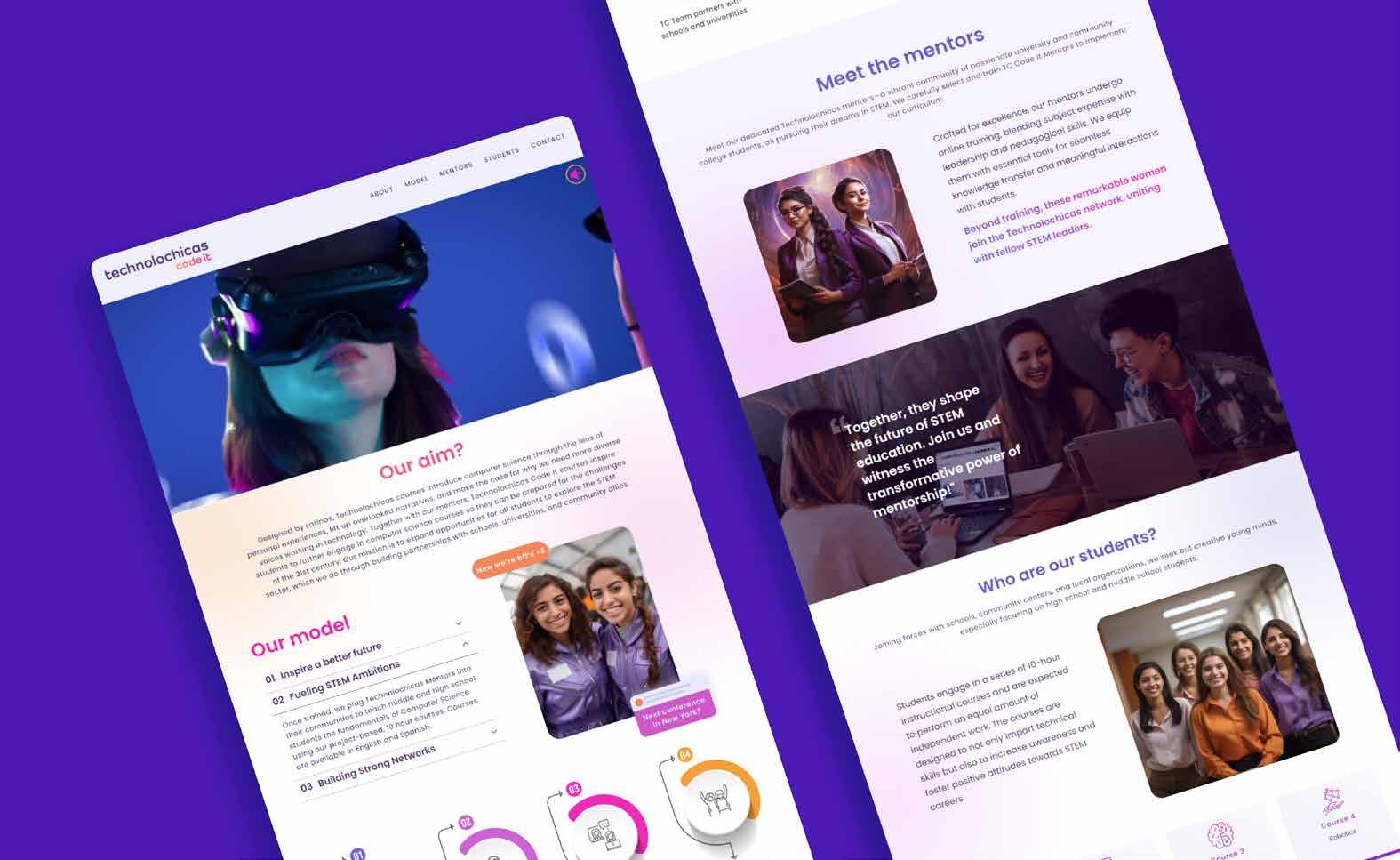 Finalmente todo ello fue integrado en un sitio web estilo One page, en el que predominan suaves gradientes y colores vibrantes, así como una comunicación cercana para mentoras y estudiantes.