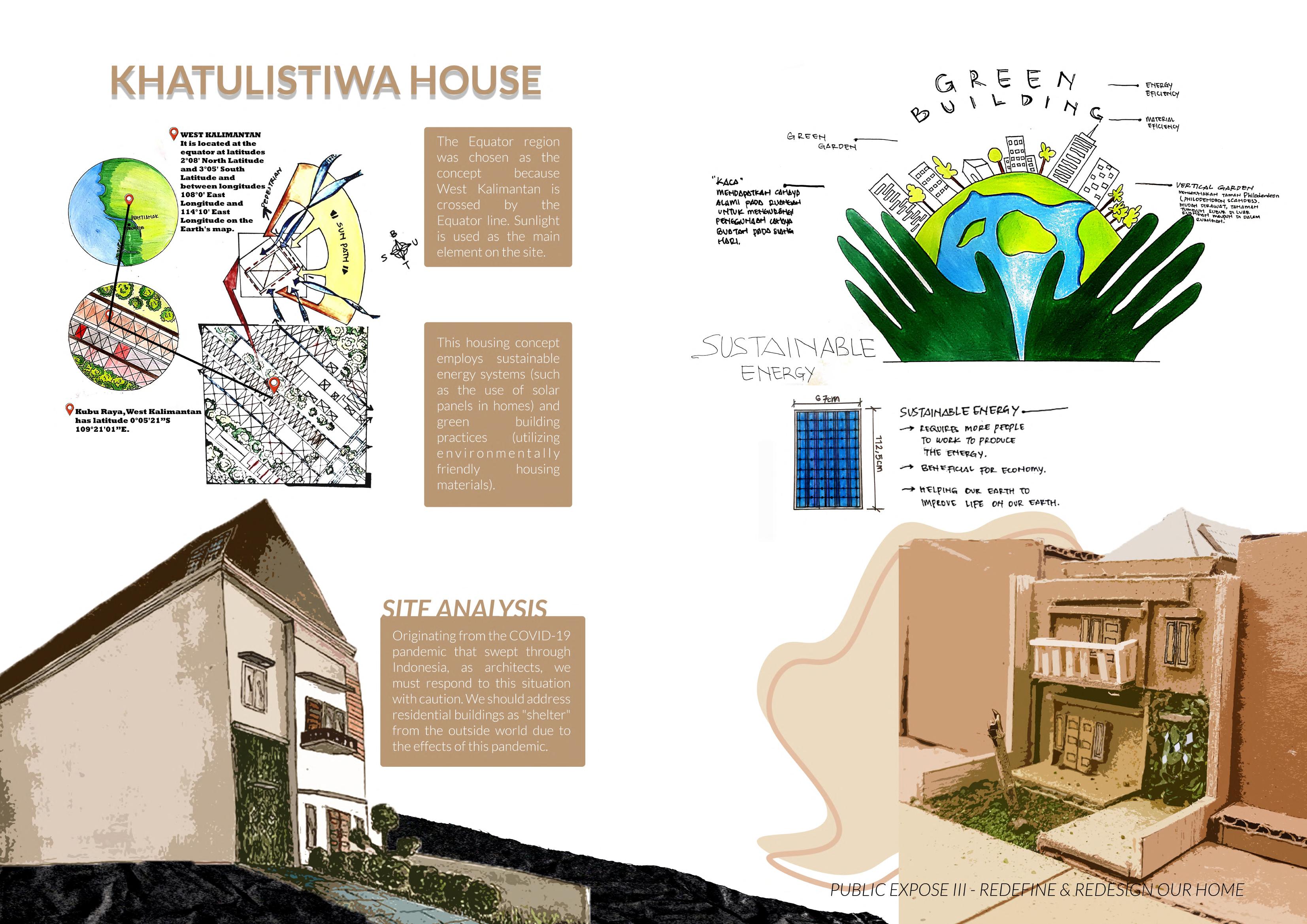 The house planning follows the theme of 'redefine and redesign,' aiming to engage architects and architecture itself in responding to the COVID-19 phenomenon that has affected Indonesia, particularly in areas crossed by the Equator. This phenomenon, which initially had negative impacts on human life, has been transformed into a source of beneficial effects, even while staying indoors to ensure safety and comfort. The approach involves creating an environmentally-friendly architectural design that benefits both the occupants and their surroundings. The goal is to provide a sense of security and comfort while embracing the positive aspects of the pandemic, all within the confines of the home.
