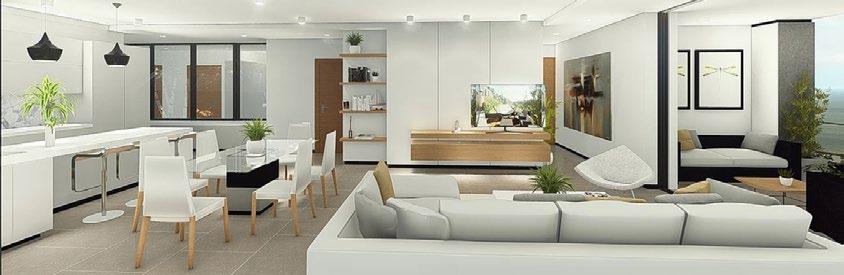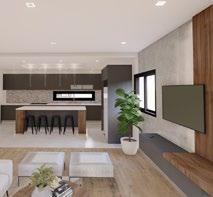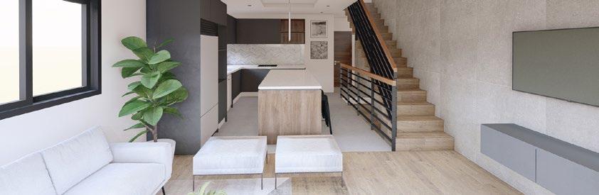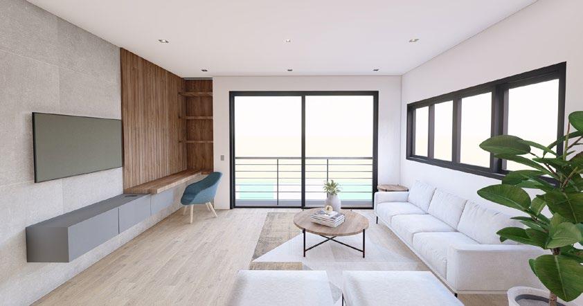 Propuesta del interior de uno de los apartamentos en Roca Condominio, proyecto de la firma Hurtado Arquitectos. En esta pro puesta se trabaja la pared del tv, materiales y color de cocina, propuesta de cerámica de piso, material de la pared de acce so, mobiliario para la terraza exterior y se proponen los puntos de iluminación y equipo.