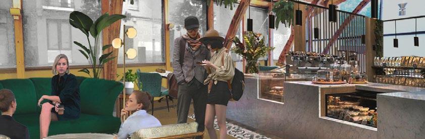 este monetaje, se presenta la idea conceptual de una barra de snacks y el tipo de mobiliario que se propone, tantos áreas de sofá como de mesas, que de igual manera pueden servir como espacios de trabajo informal. MG6X12