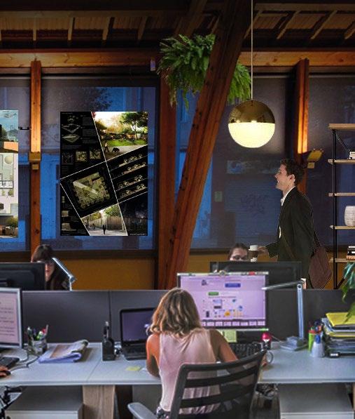 Esta propuesta se hizo a modo de collage. Todo fue hecho a base se montaje en photoshop con recursos encontrados en línea. En esta imágen (de izquierda a derecha) se pueden ver los puesto fijos de trabajo, un area libre, donde los trabajadores pueden hacer reuniones infomales o sentarse a trabajar, y al lado derecho las salas de reuniones.