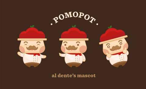 Al Dente’s overall brand uses the three colors of the Italian flag (green, white and red). The main focus of the restaurant is to serve authentic Italian dishes for all generations. The overall visual style is very rustic or home-like. This ambiance gives off the full-on Italian experience. There is also a mascot named ‘Pomopot’ that is made for the restaurant. Pomopot is a combination of an Italian chef, a tomato and a pot. Its name is taken from the word ‘pomodoro’ which is the Italian translation for tomatoes.