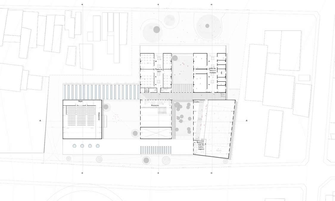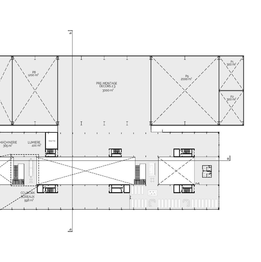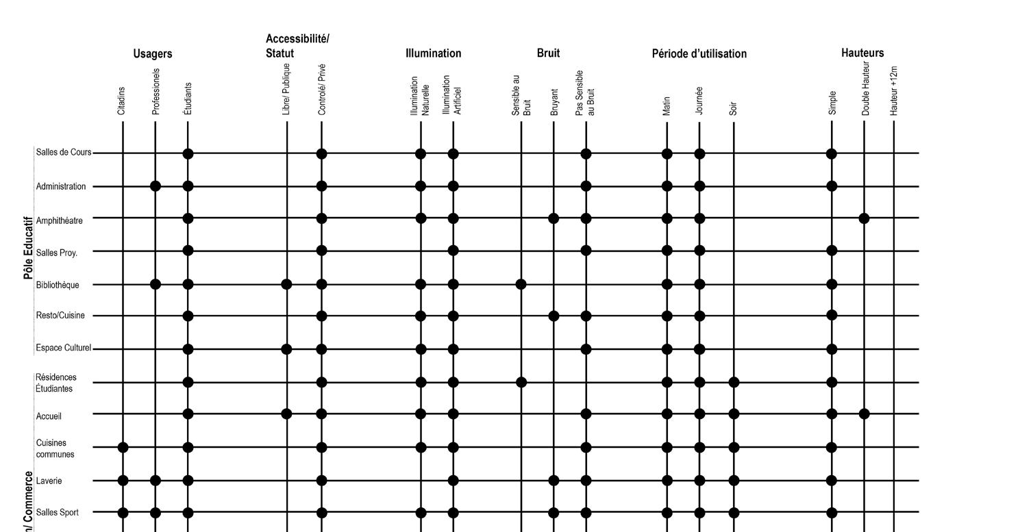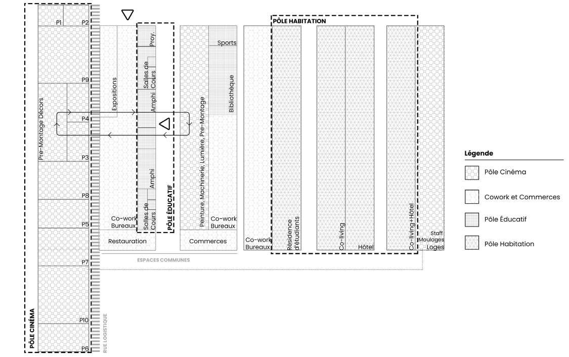 Le projet porte sur un bâtiment qui peut réunir plusieurs usages et qui peut converger les uns vers les autres, y compris les studios de cinéma, c’est pourquoi la disposition et les circulations sont essentielles à la conception. Pour cela, on procède à une analyse du programme qui permet de comprendre les besoins de chaque partie du programme et ses exigences. Il identifie celles qui peuvent être partagées entre différents utilisateurs et celles qui sont privées.