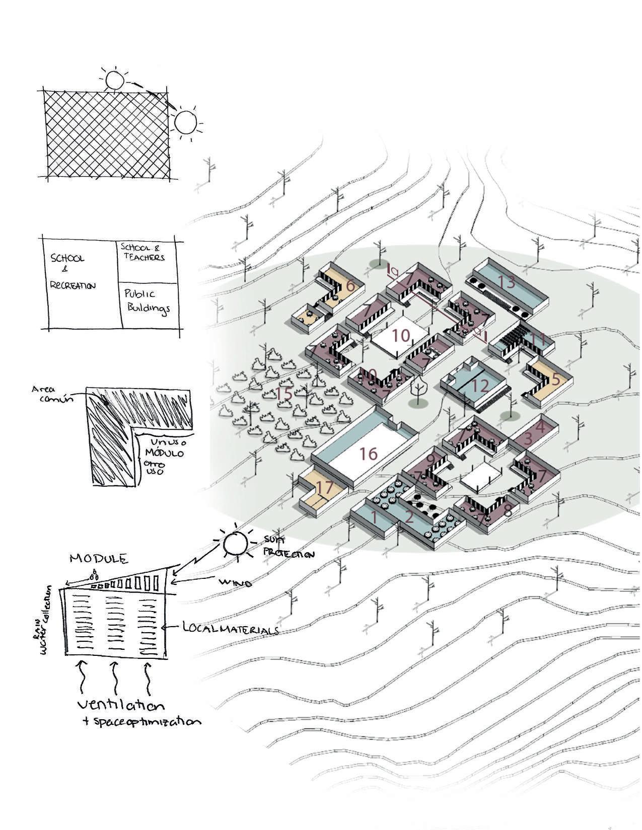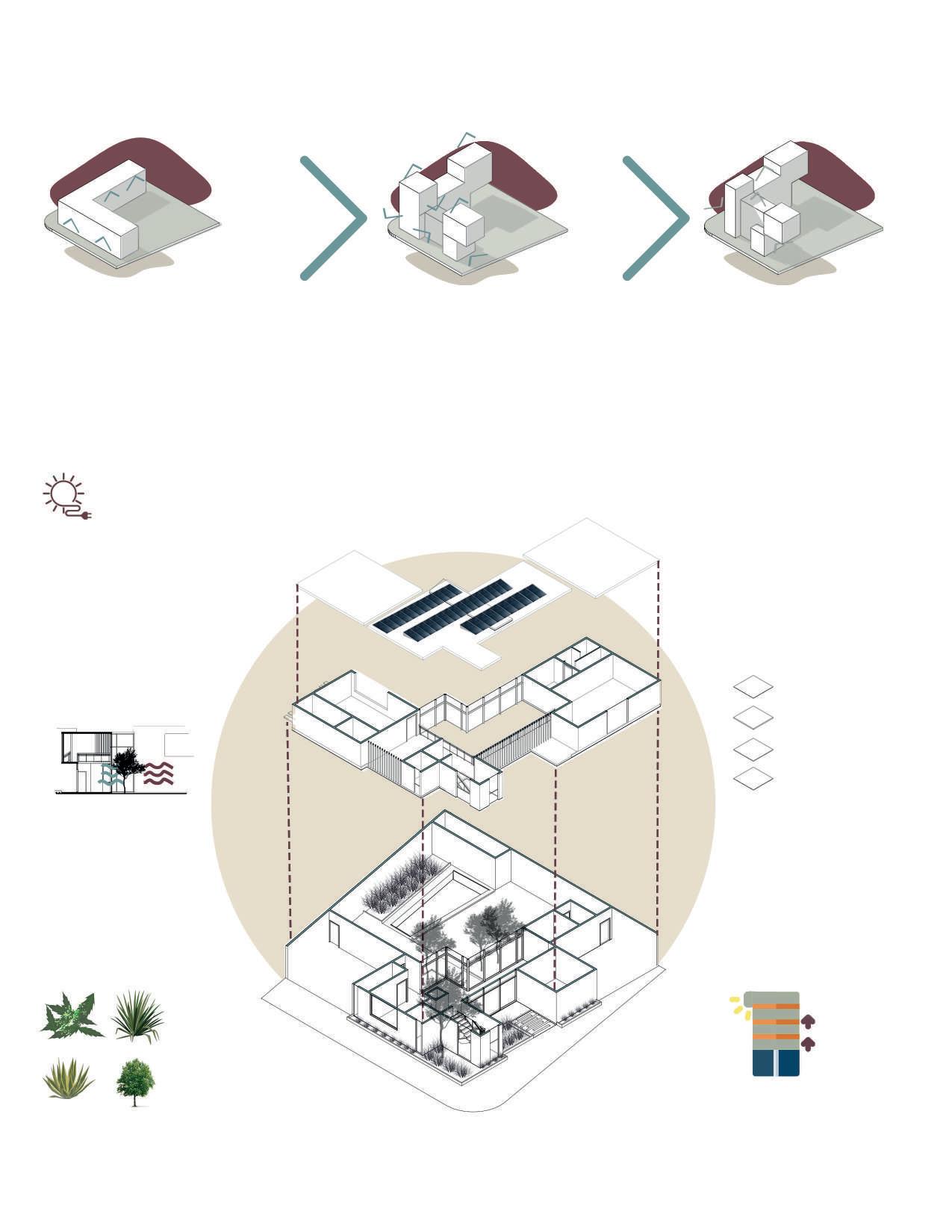 L’entrée principale est située entre les volumes du musée/de la bibliothèque et la piscine. Les volumes situés à l’est entre les bâtiments sont accessibles depuis la Calle Jalisco. Les bâtiments sont reliés par des galeries. Ces galeries sont larges, ce qui leur permet d’être utilisées comme des extensions du programme du projet. Pour plus d’informations : demander le book dédidié a ce projet, puis que c’est un Projet de Fin d’études.