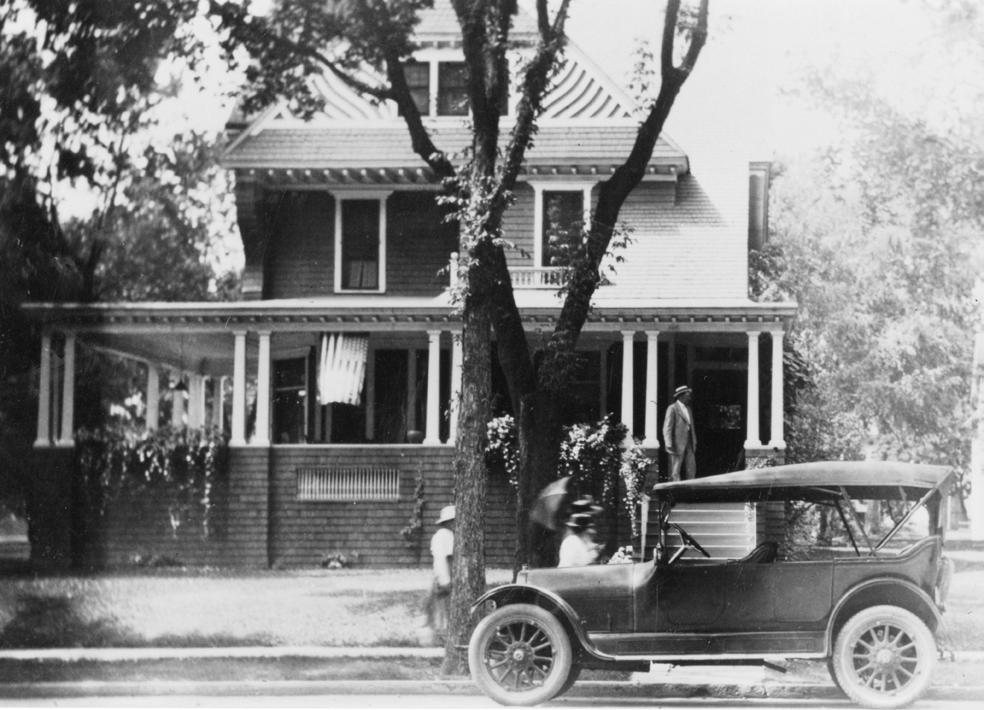 At 303 N. Summit stands the home of William A. Beach who owned the area’s largest printing company. Will A. Beach Printing Company was east on 7th and Phillips within walking distance from his stunning two and one half-story shingle-style house. The list of details used to ornate its exterior is long and varied: lintels, pediments, dentils, and a bull’s eye window. Large balustrades support a porch, shake shingles cover the upper two-thirds and horizontal siding runs juxtaposed on the lower third.
