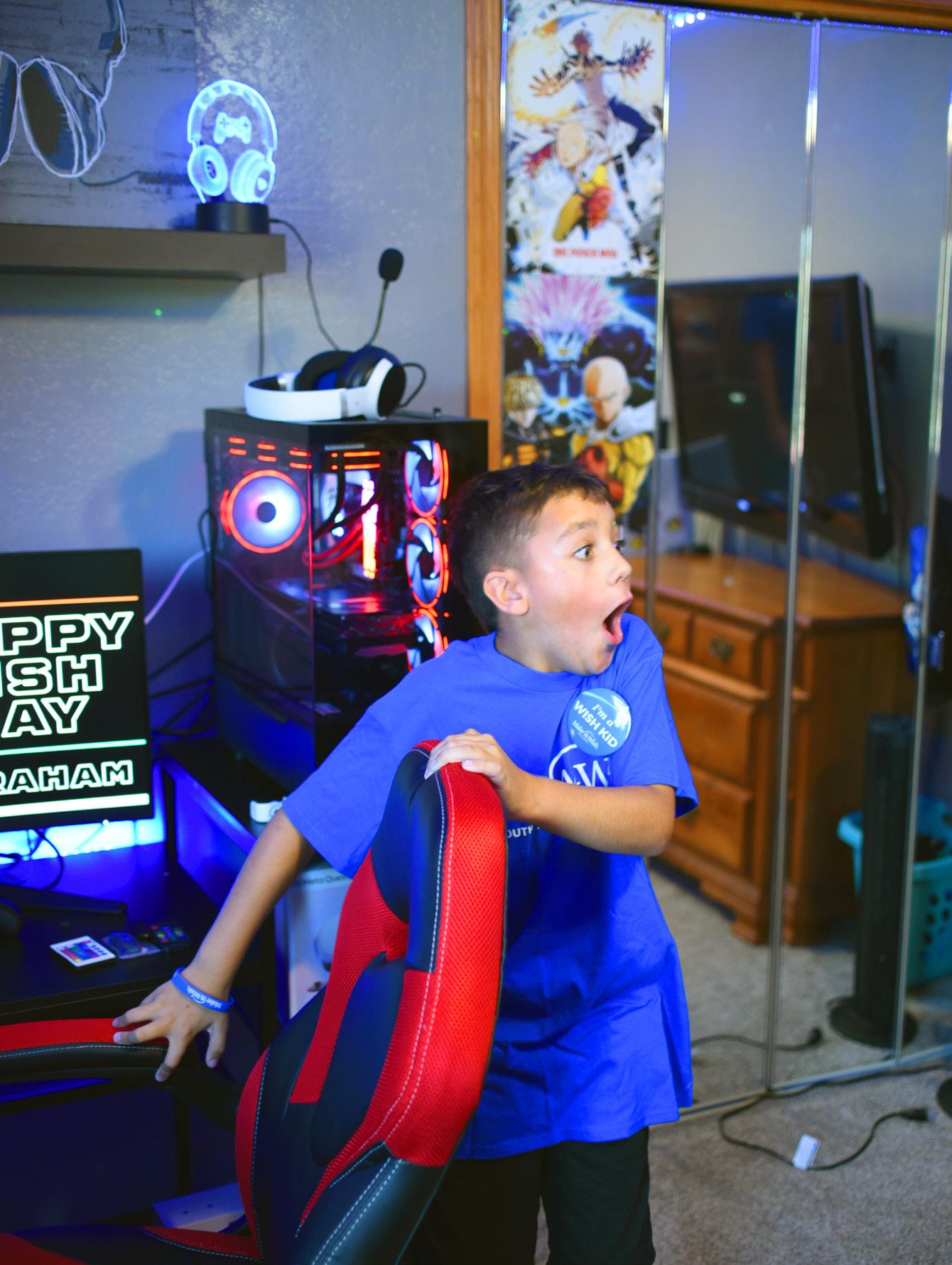 Wishes vary widely, whether meeting a superhero, traveling somewhere special, or feeding a giraffe. Sue remembers the first wish she experienced nearly eight years ago: Edison’s wish for a space-themed room makeover. “Edison wore an astronaut suit all day while he was off having fun away from his home so the room transformation could happen. We all watched as he joyfully walked up his driveway and into his house to see his new space-themed bedroom where a real astronaut had left him a video message on his brand new iPad.”