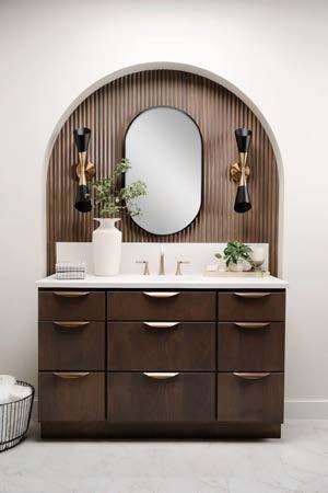 Bathroom displays draw inspiration from some of our leadership’s most beloved travel destinations, including Scotland, the Hoh Rain Forest, Sedona, Doral National Golf Resort, and Acadia National Park. These curated spaces blend texture, color, and personality—capturing the kind of elevated aesthetics that feel right at home on HGTV, but grounded in real-life function.