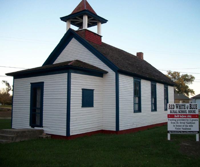 While the majority of one-room schools were painted white, the settlers near Geddes chose a patriotic theme. The siding was white with blue trim boards and topped with a red bell tower. The Red, White, and Blue school, built in 1884, now stands in the Geddes Historical Village and is open to the public.