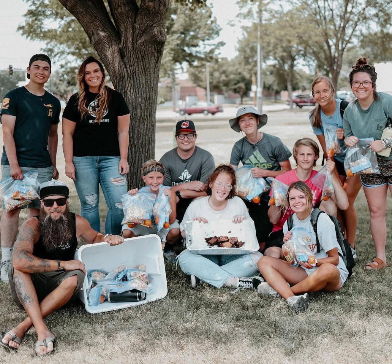 Photos top to bottom: Beautiful food setting an atmosphere that invites people to gather together; Axell and Zahra pictured together; Akwa and Landi pictured with their family on Letter & Light Co. marquee letters; Landi helping others through a service project