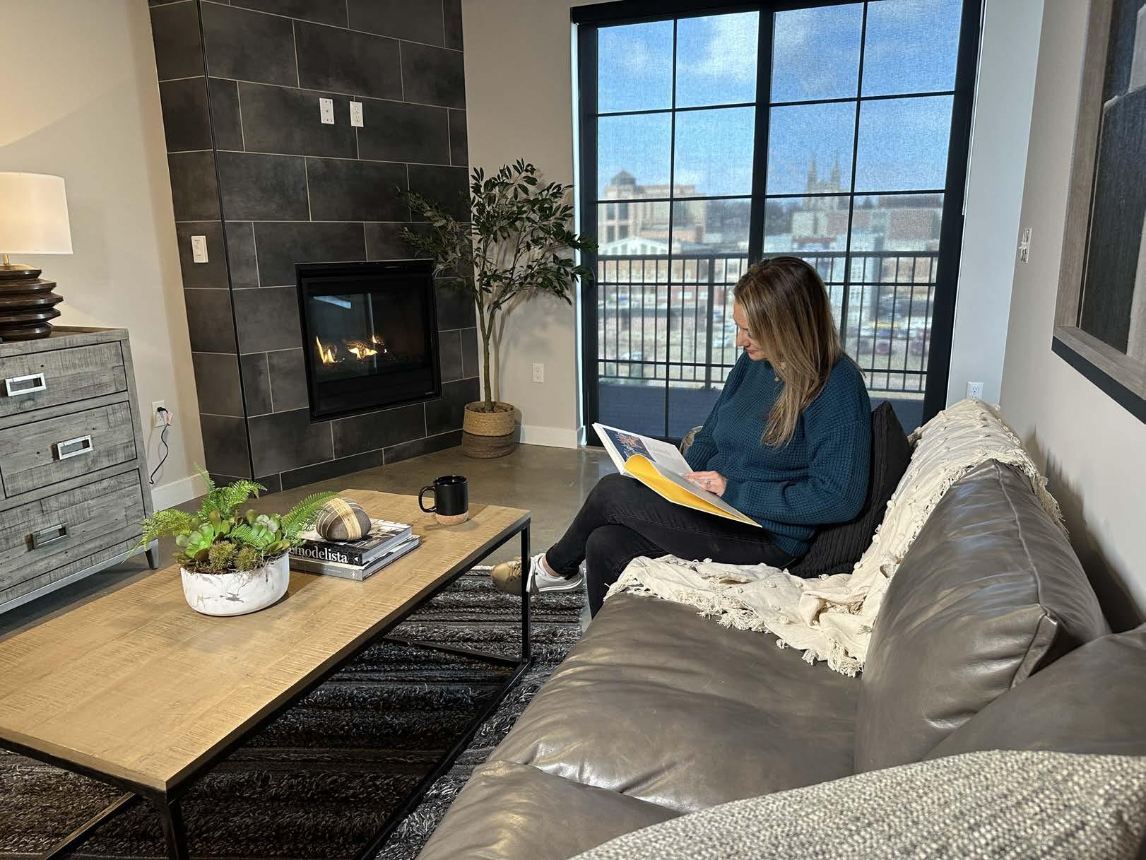 The living room’s floor-to-ceiling focal point is a double-sided fireplace. The contemporary linear gas fireplace facing the living room is surrounded by quartz, accented by custom steel and wood elements.