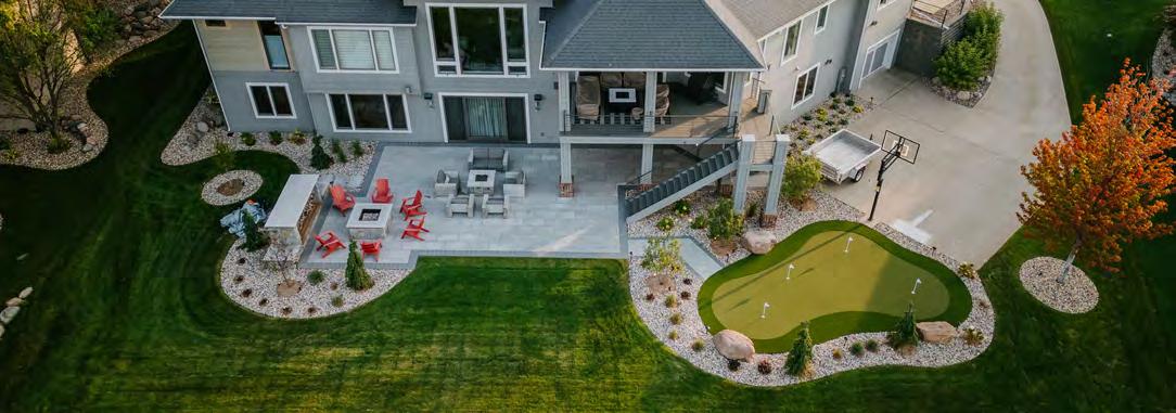 Working closely with a landscaper, the Georges and their clients embraced a “start big, then refine” philosophy. The yard’s design, fenced on the perimeter, was purposely decorated with hardy low-maintenance plantings and a thoughtful mix of sod, concrete, and pavers that balances beauty with practicality. Hydrangeas and other easy-care plants add lush greenery without the stress of a robust maintenance schedule.