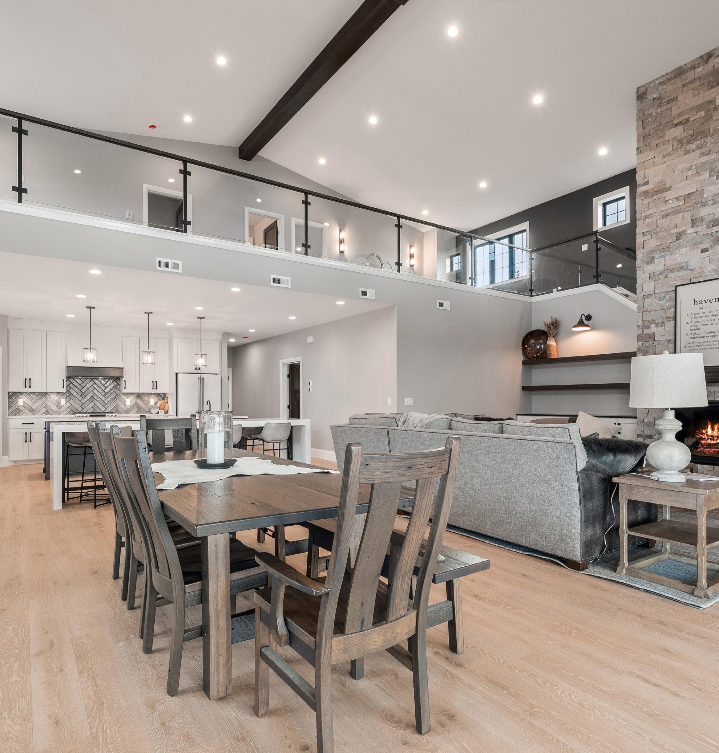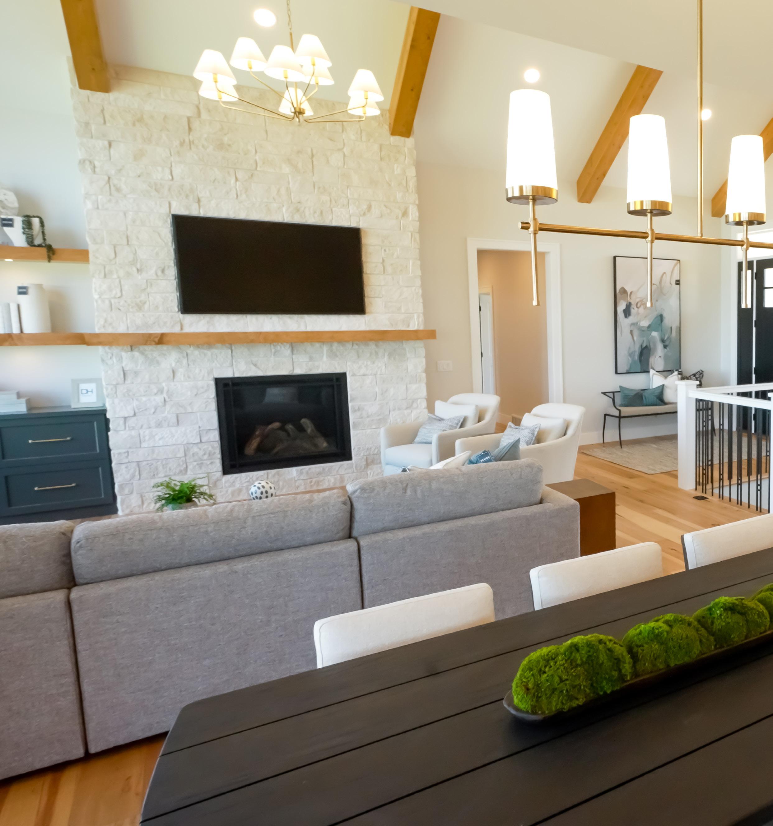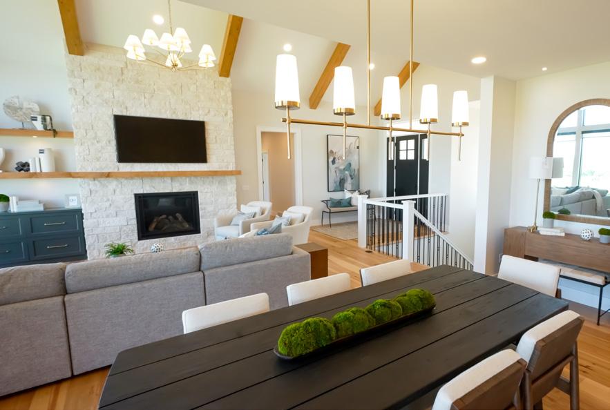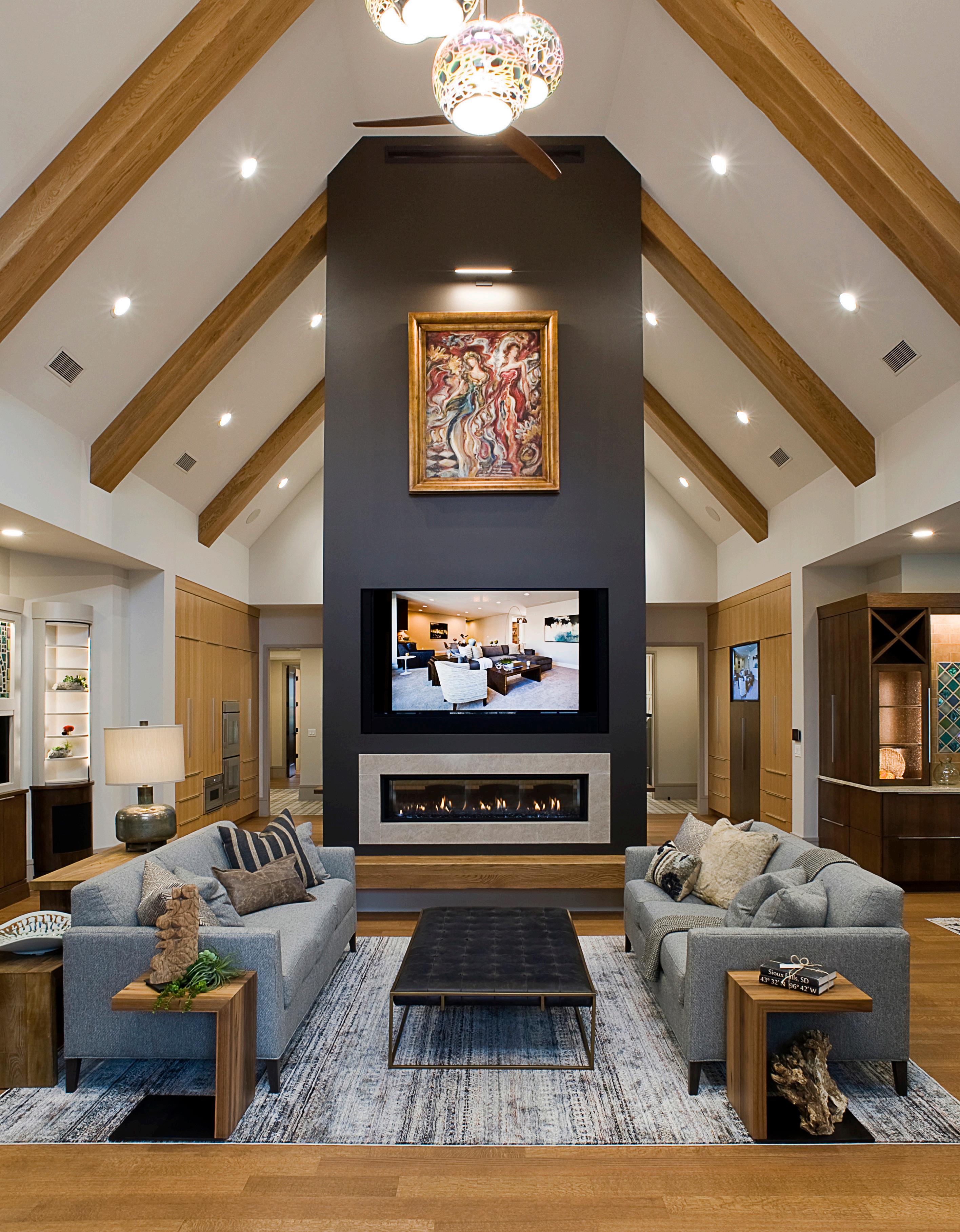 “The four-sided floor-to-ceiling fireplace anchors the open-concept living room, kitchen and dining room. The gas fireplace’s surround is created from dry stack natural stone, which doesn’t use mortar. Every stone is cut precisely to fit together,” Chad shares.