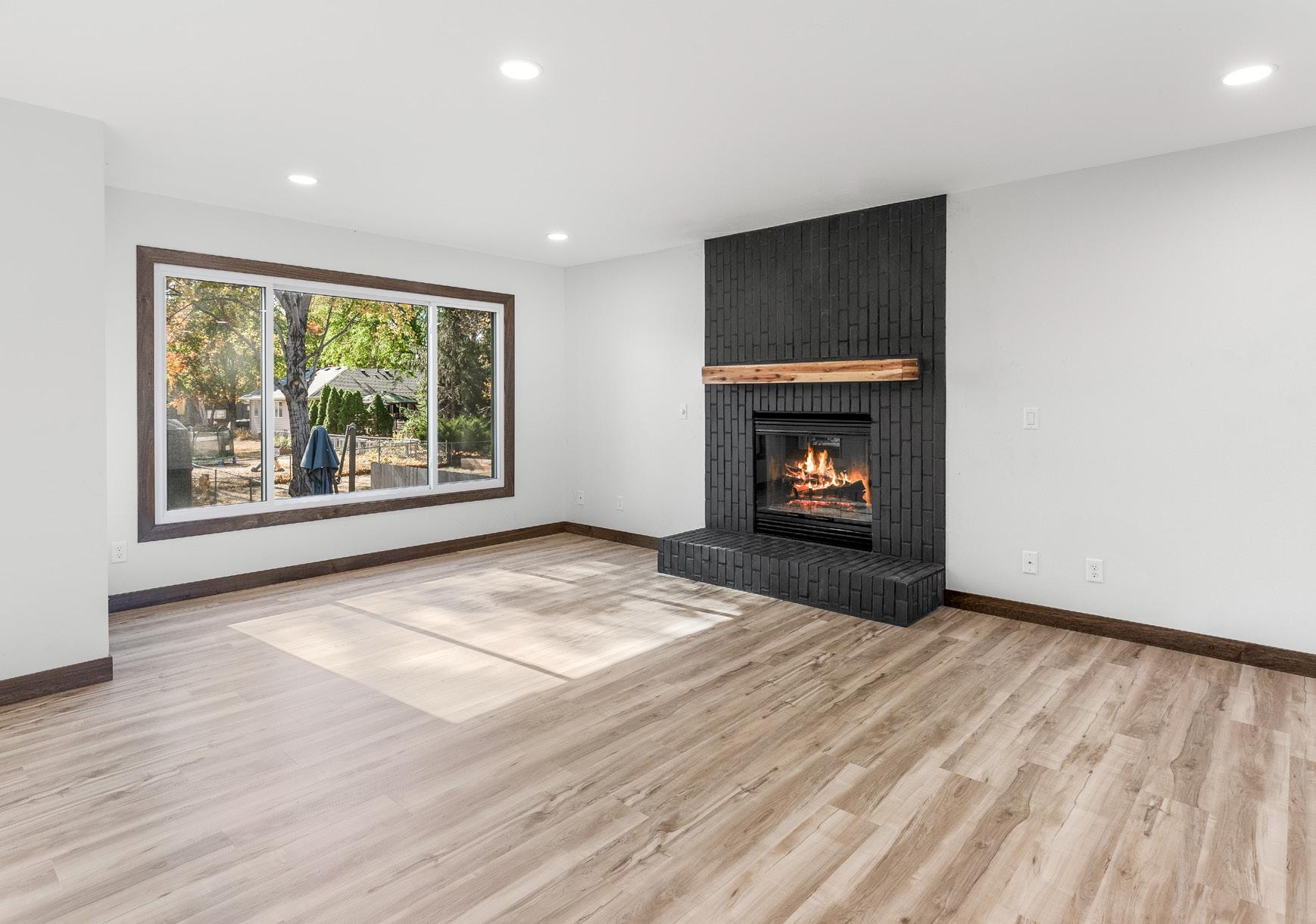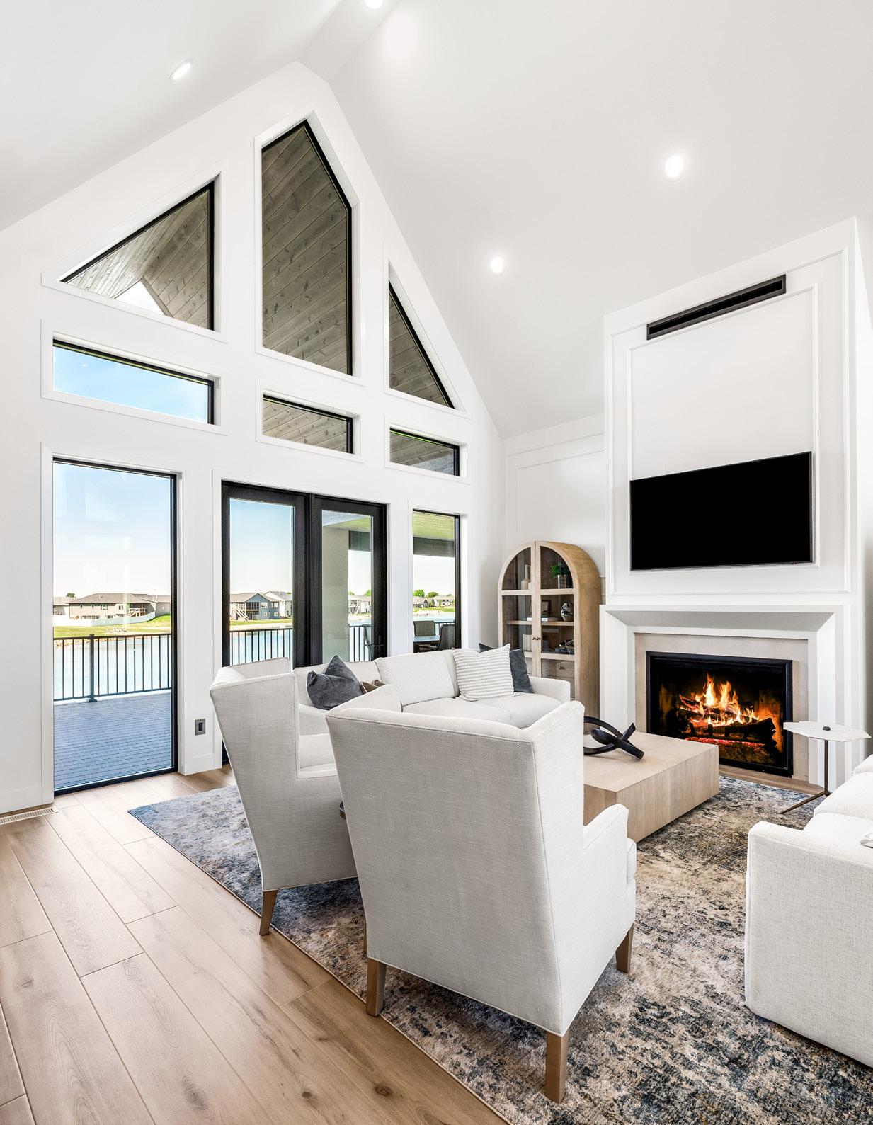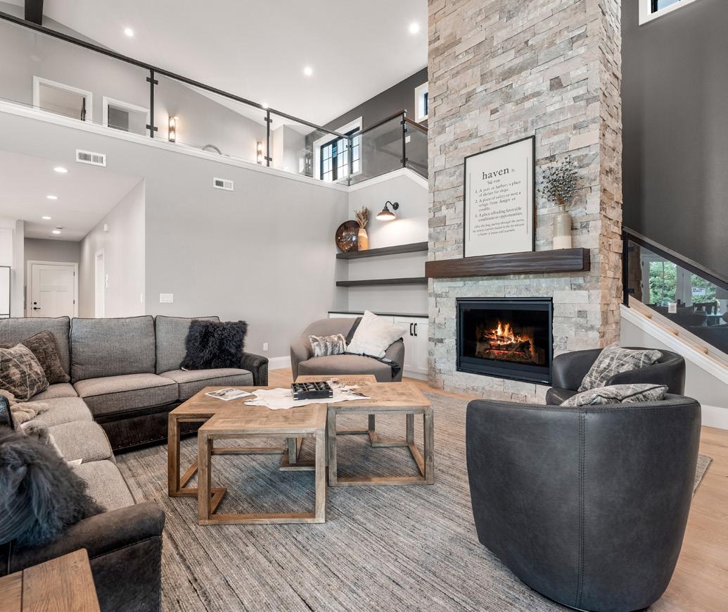 “The four-sided floor-to-ceiling fireplace anchors the open-concept living room, kitchen and dining room. The gas fireplace’s surround is created from dry stack natural stone, which doesn’t use mortar. Every stone is cut precisely to fit together,” Chad shares.