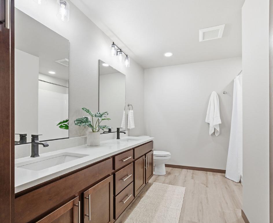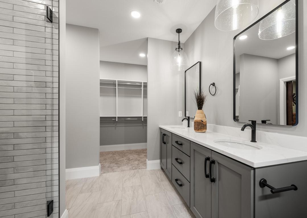 The main-level master suite offers a peaceful retreat, featuring a walk-in closet and double-vanity bathroom with heated tile floors, a custom-tiled zero-entry shower, and under-cabinet LED lighting.
