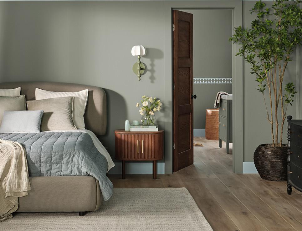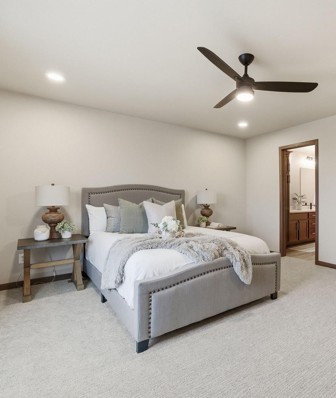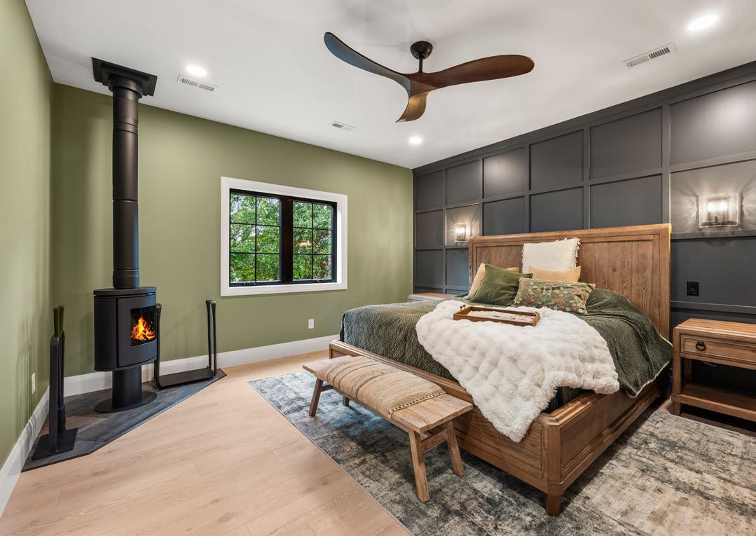 The master suite is a cozy retreat highlighted by a painted wall that’s a McCoy Construction specialty. The bedroom accent wall is covered with 2-foot by 2-foot wooden squares.