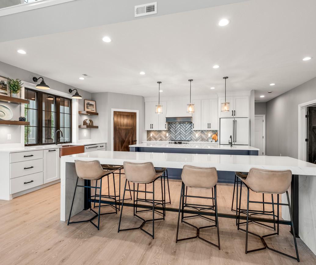 The vintage farmhouse-meets-modern style aesthetic continues in the kitchen, which is accented by a copper sink, open shelving, and wooden accents on the pantry door and one of the two kitchen islands.