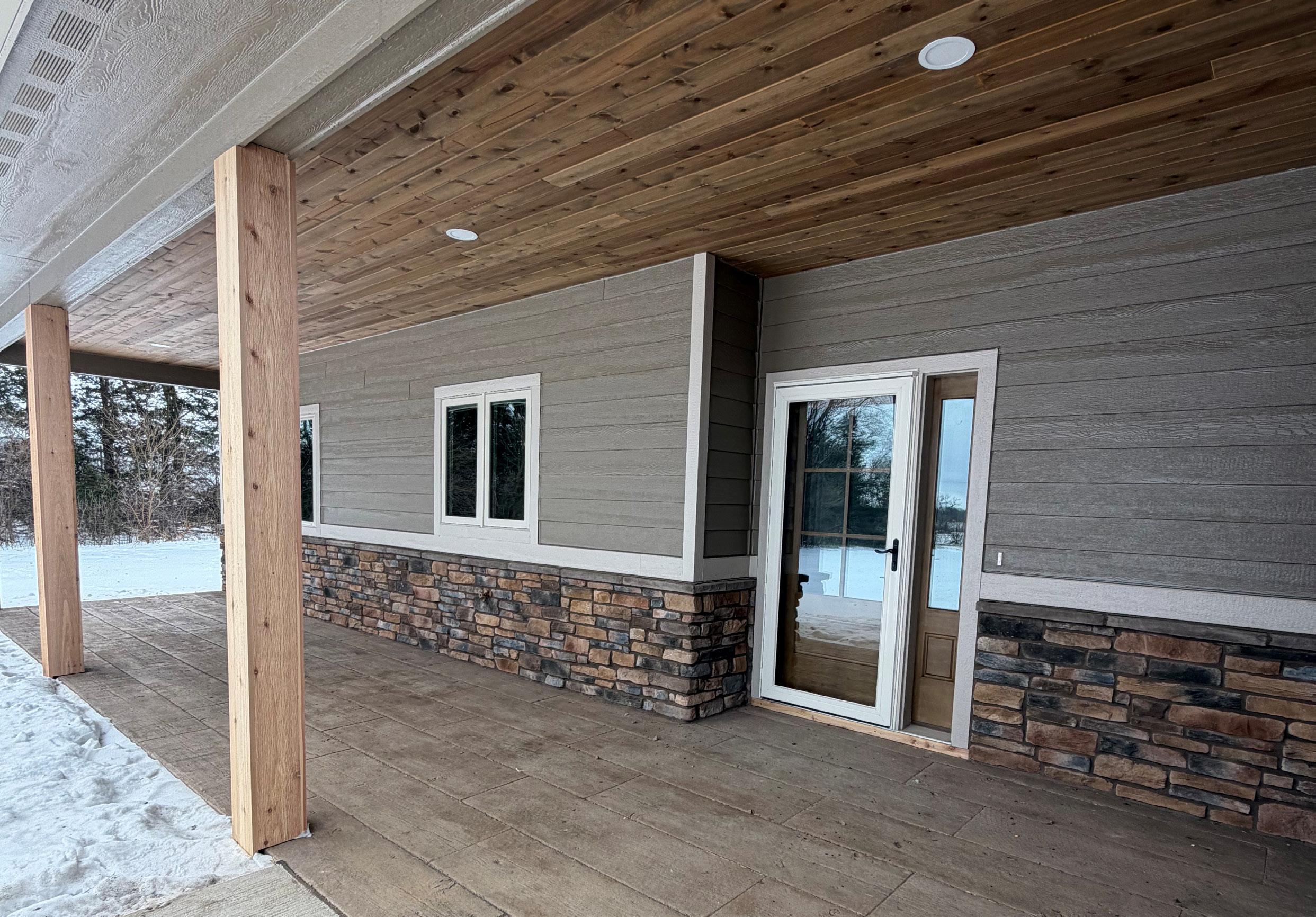 A hand-framed roof and timber frame, with wood, brick, wainscoting and stone accents, create a welcoming front entrance and exterior.