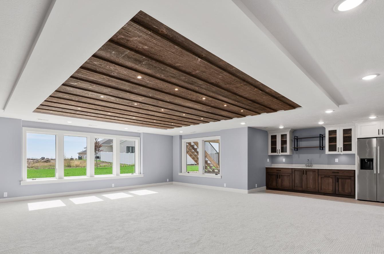The basement serves as the ultimate entertainment space. A barn-wood ceiling with integrated lighting highlights the 20-by-26-foot family room, which features a natural stone gas fireplace at one end and a built-in wet bar with a full-sized refrigerator at the other. Two bedrooms with walk-in closets and a full bathroom complete the lower level.
