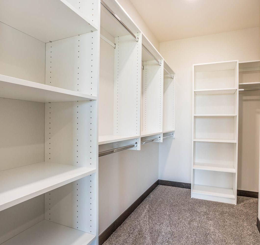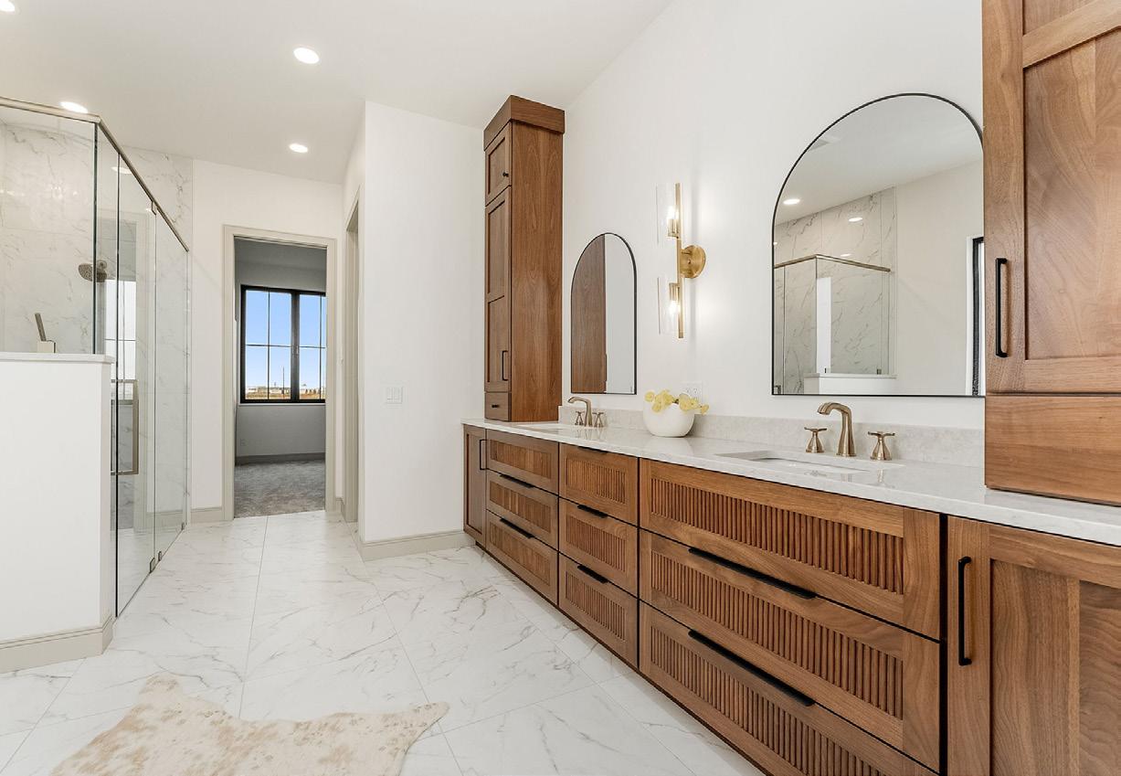 Designed with comfort in mind, the master suite includes a spacious walk-in closet. Pampering awaits in the bathroom featuring heated floors, a custom tiled walk-in shower, and gorgeous dual vanities with Maple cabinets and onyx counters.