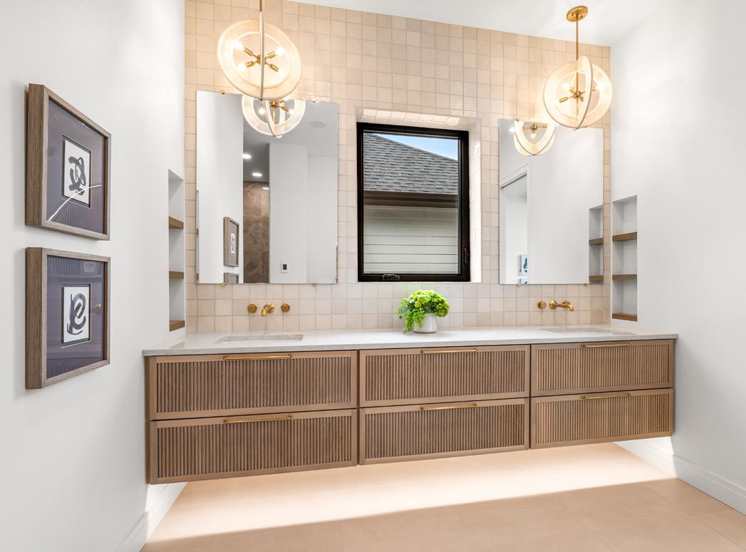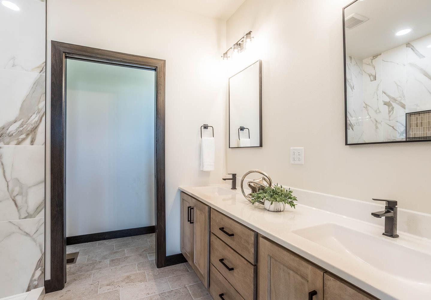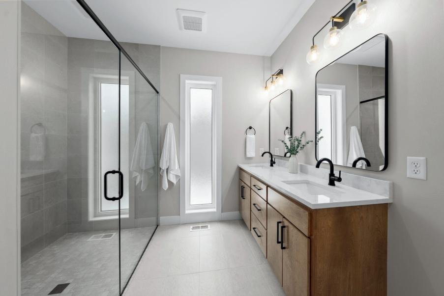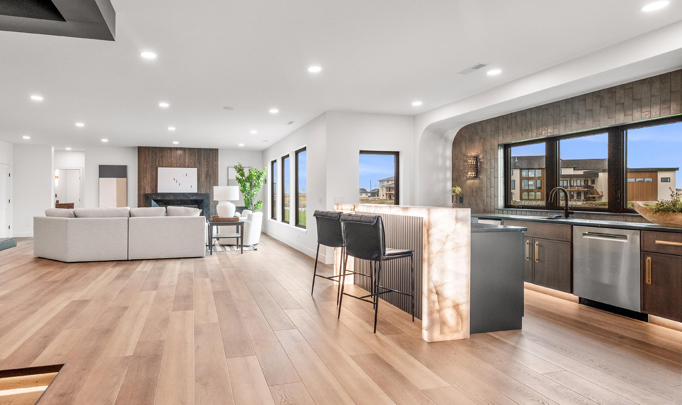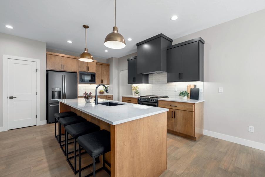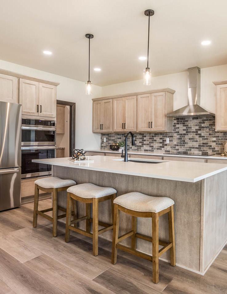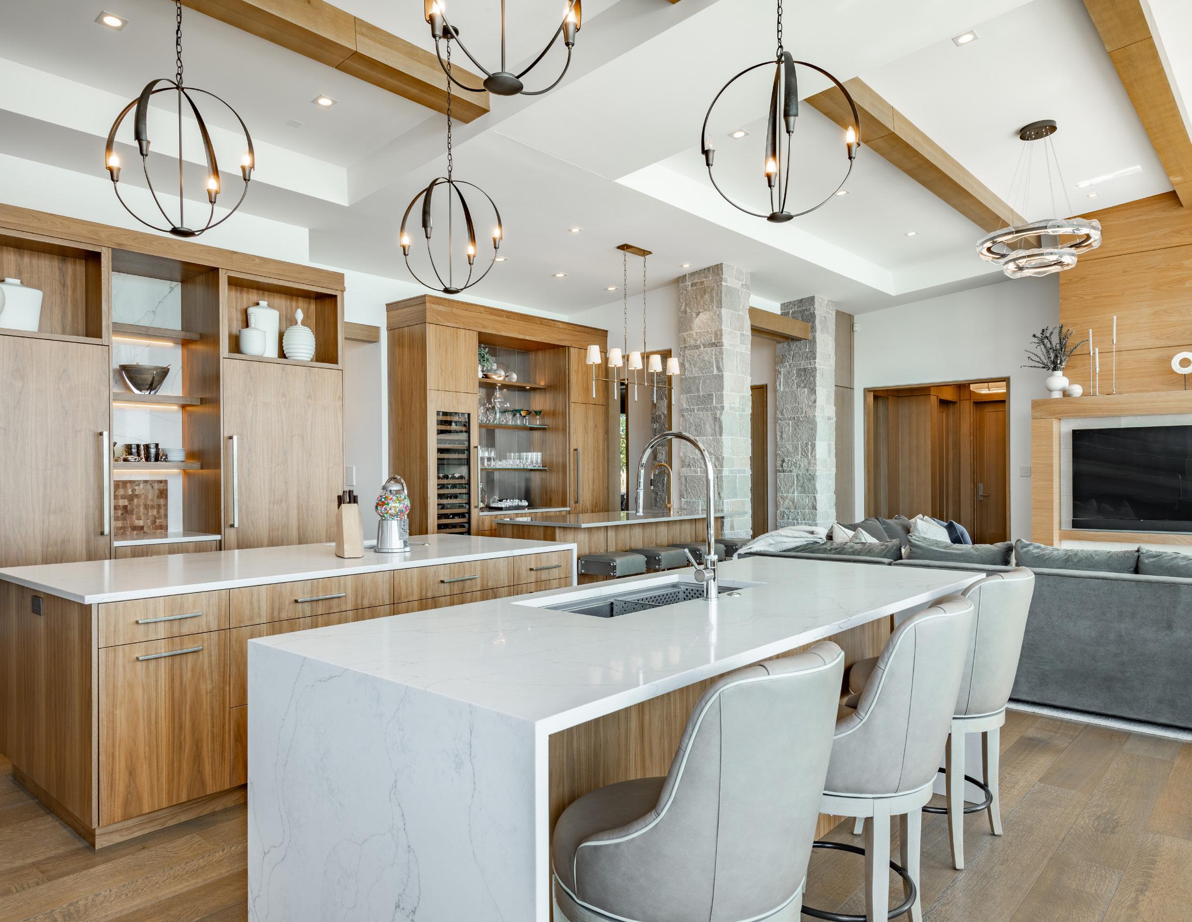 “We went modern transitional with the interior finishes,” Danielle notes. “We are seeing much more of a push for those natural finishes and more muted tones. It’s an organic feel where mixing textures, wood, and natural elements is a little bit of an easier slate to work with. It gives you so many more options for finishes you bring into your home.”