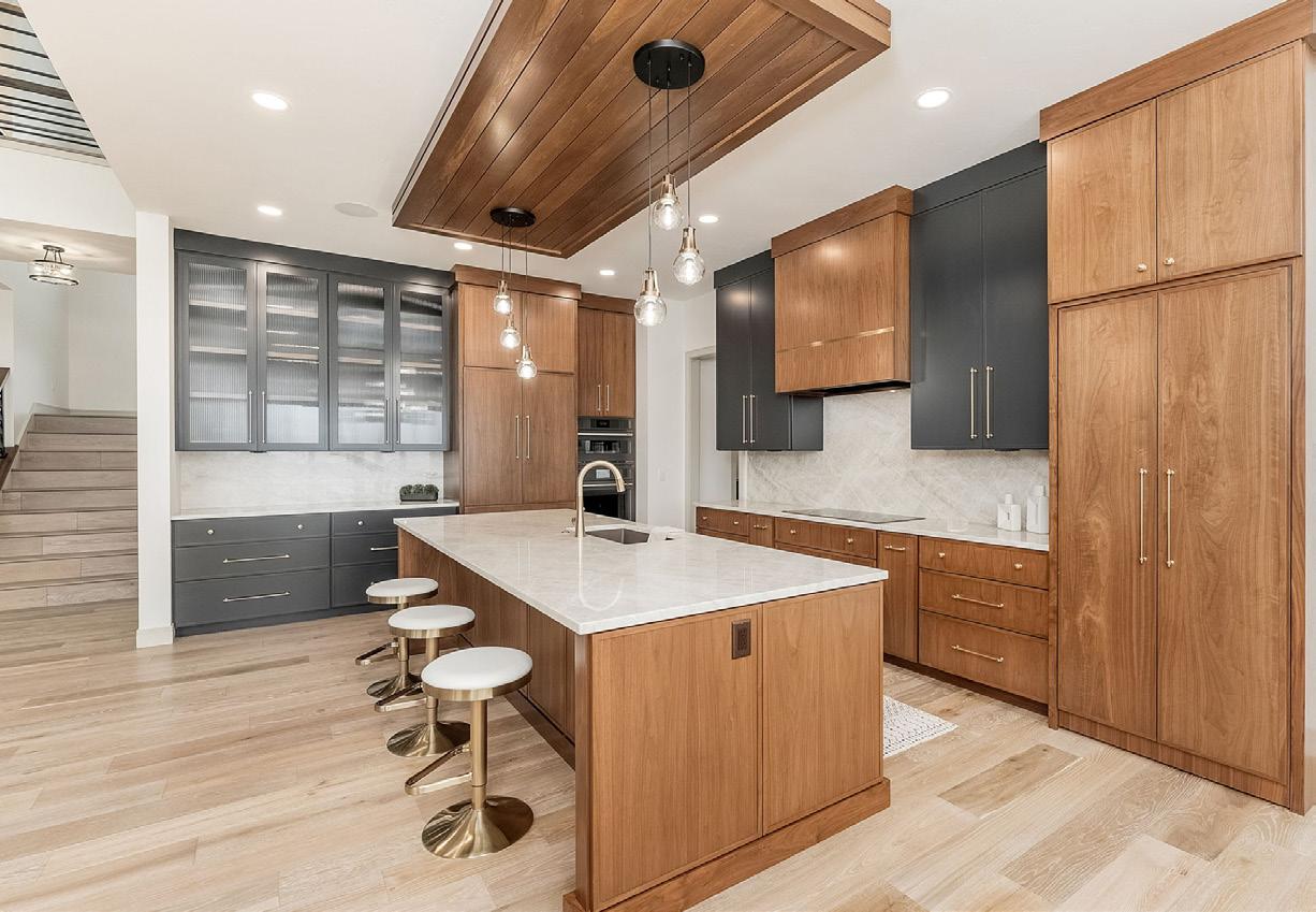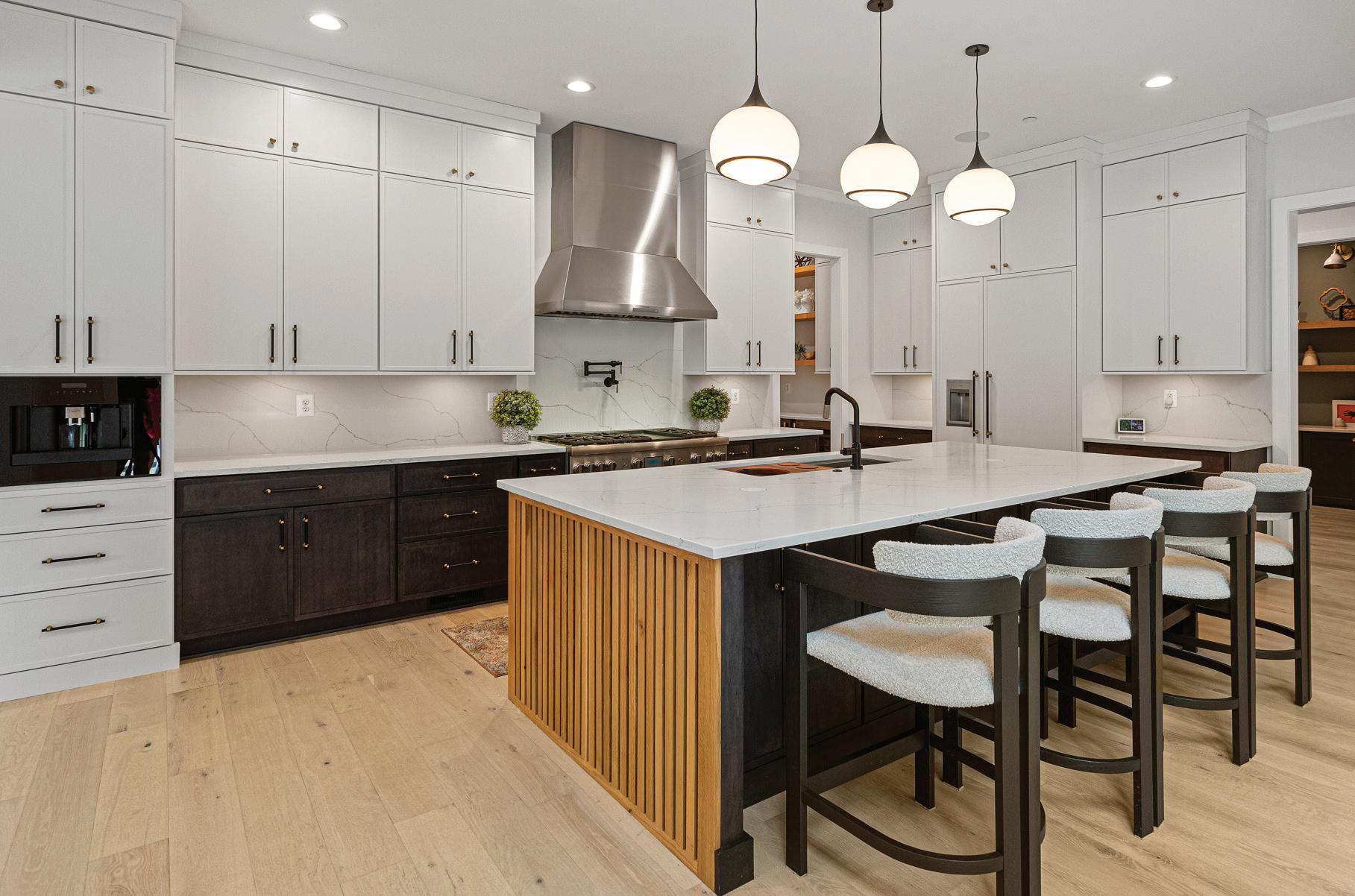 White oak cabinets and quartzite counters in the kitchen are not only clean and contemporary, but also durable. A large walk-in pantry provides additional food preparation space and abundant storage, with another window to showcase the lake view.