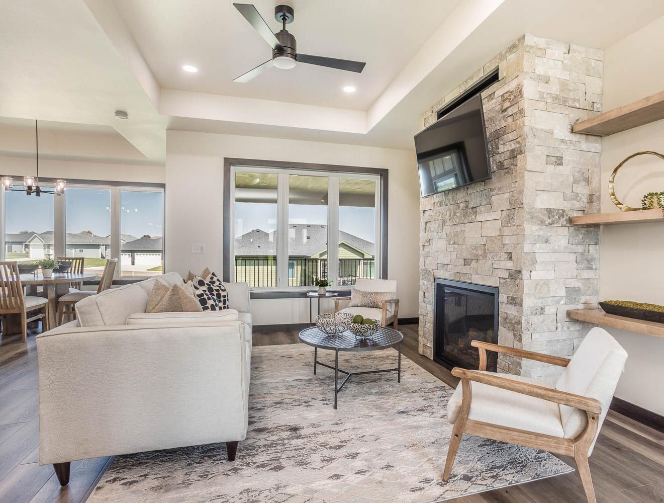 The heart of the home is its open-concept living room, kitchen and dining room. The living room’s captivating focal point is a gas fireplace surrounded by dry-stack natural stone. Tray ceilings enhance the spaciousness of the living and dining rooms.