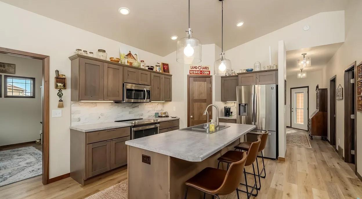Welcome to the Lakes Community and Lakes Golf Course nestled between Lake Madison and Lake Brant. This 3 bedroom, 2 bathroom, 2,190 sq. ft. home is located on hole number 8 of the Lakes Golf Course and includes a fully finished 3 stall garage with plenty of room for your toys. From the moment you walk through the front door you will appreciate the openness of the kitchen, dining and living room with views of the fairway on hole number 8. The HOA takes care of street lights and includes a community park with a playsystem, sand volleyball, pickleball, a dock on Round Lake and a shelter for only $150 a year. The roads are maintained by a Road District for $600 a year that is assessed through property taxes.