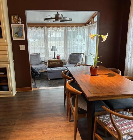 Centrally located and refreshingly not a typical multi-level home, this well-maintained three-bedroom, three-bath residence sits prominently on the corner of 4th Avenue and 30th Street. Originally built as a hunting lodge and moved to the property in 1934, the home showcases beautiful wood paneling on the main floor that highlights its rich history and warmth. The spacious living room features a vaulted ceiling and a wood-burning fireplace, creating an inviting gathering space. The expanded kitchen offers ample room for a table and chairs and flows seamlessly into a bright sunroom-perfect for everyday living or entertaining. Outside, the spacious yard is accented by mature trees-some with stories of their own-and includes a detached garage equipped with electricity and a wood-burning stove, ideal for hobbies or extra workspace.