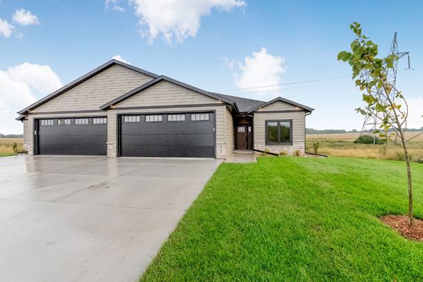 All photos are “similar to.” New Construction twin home on Hole #9 of The Lakes Golf Course near Lake Madison. 3 beds, 2 baths, and oversized, fully finished 2-stall garage. In-floor heat throughout the twin home including the garage. Primary suite is large with golf course views, a double vanity, large walk-in tiled shower with two heads and sizeable walk-in closet. The kitchen/dining and living room is an open concept with lots of natural light. Quartz tops throughout the twin home including the bathrooms and kitchen includes tiled backsplash. 6-foot island in kitchen with pendant lighting. Plenty of storage throughout with cabinets in the mudroom off the garage and in the laundry room along with closet organization in all closets. There is a slider off the dining room to a covered patio with great views of the hole number 9 fairway. Anderson windows throughout. LVP flooring everywhere except bedrooms. Cedar ceiling in entryway and ceiling on the covered patio. Lawn will be seeded and includes underground sprinkler and rock around the home. The HOA takes care of streetlights and includes a community park with a play system, sand volleyball, pickleball, a dock on Round Lake and a shelter for only $150 a year. The roads are maintained by a Road District for $600 a year that is assessed through property taxes. Still time to customize some finishes. Call Now!