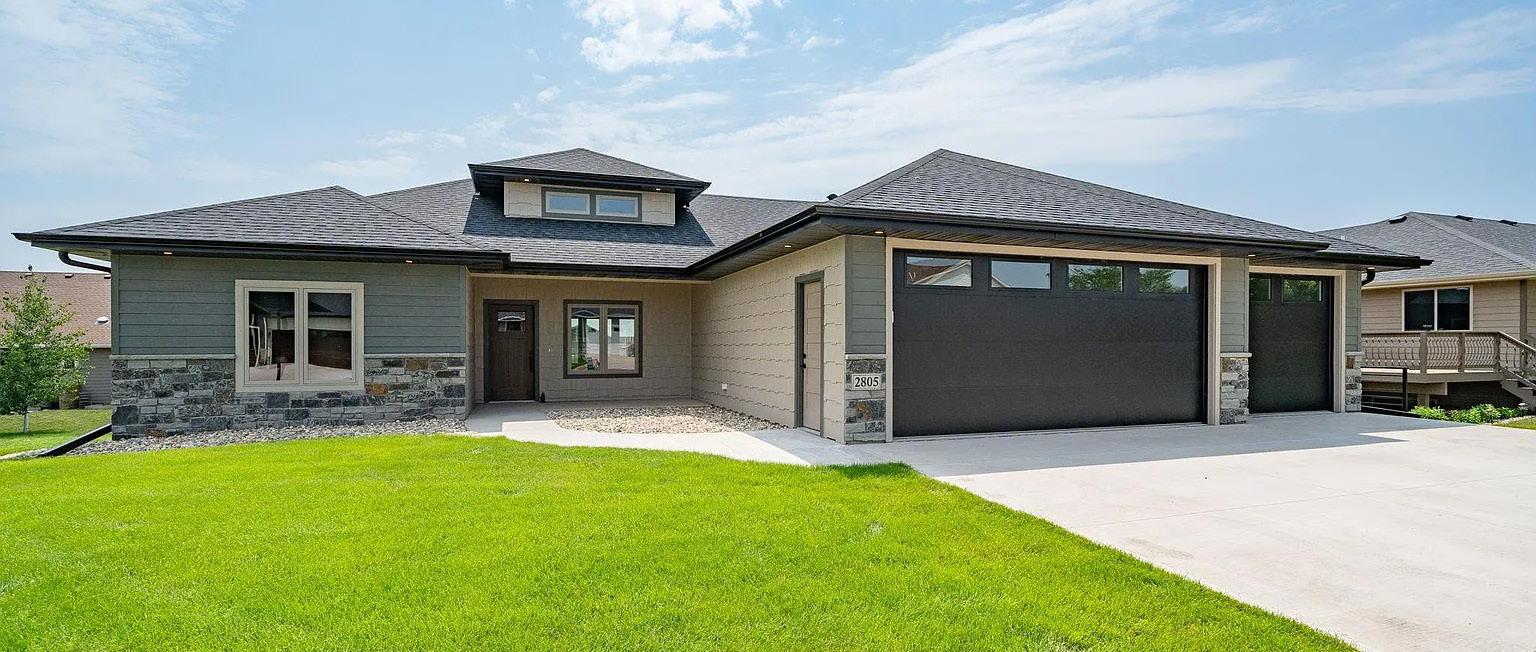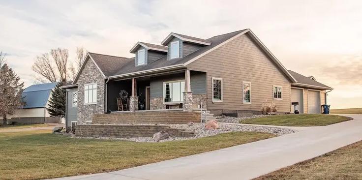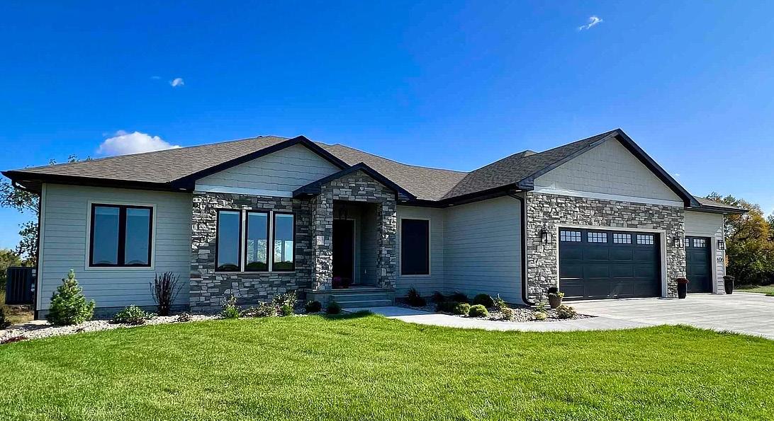 New construction ranch home slab-on-grade no steps with over 1,500 sqft of finished space in a new Rock Rapids, IA development. Primary bedroom has a large tile shower and a large walk-in closet. The main floor features a large living room with a fireplace open to the dining area. The kitchen has onyx countertops with a large center island and pantry.