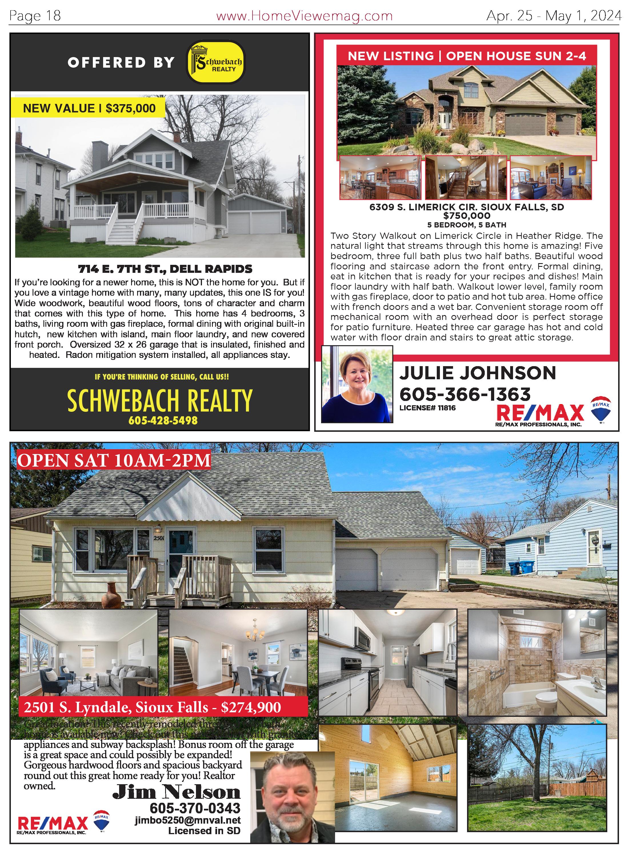 Page 2 www.HomeViewemag.com Apr. 25 - May 1, 2024 Michels Communications Corporation PO Box 91606, Sioux Falls, SD 57109 Hanna Michels 1.605.760.4269 hanna@michelscom.com Jill Foley 1.712.490.8506 jill@michelscom.com Cory Johnsen 1.605.951.3567 cory@michelscom.com For Advertising Information, Please Contact: NEW LISTINGS & OPEN HOUSES PAGE 13 & 21 Make yourself at home HANNA MICHELS FOLEY CORY JOHNSEN Contact us today about the following loan options: Your Mortgage Lending Specialists Ryan Kaufman 605.252.5698 NMLS# 1503898 Teresa DeWolf 712.577.1810 NMLS# 1563290 Ready to buy your dream home? We’ve got you covered! Conventional VA FHA We also offer down payment assistance in IA, SD and MN. *All loans are subject to approval. Terms and conditions may apply. QR code may result in additional carrier or phone service provider charges. heritagebankna.com
