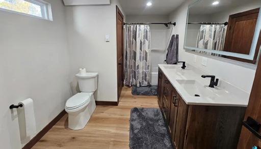 Four Bedroom, two bathroom split foyer with 1,554 finished square feet in a southeast Sioux Falls cul-de-sac. Open concept on main floor with a slider to the 16 x 14 deck with a huge fenced backyard. Living room is spacious with hardwood floor and bay window. Two spacious main floor bedrooms with a full bath. Basement has nice sized family room with new laminate flooring and 2 additional bedrooms with full bath. New furnace and air conditioner. Large oversized 2-stall garage with shelving and workbench area. This home has the perfect balance of having a convenient SE location and yet the quiet living of a cul-de-sac. All appliances stay.