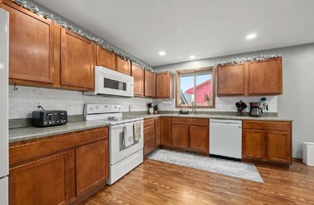 Welcome to this beautifully updated Cape Cod–style home nestled on a generous halfacre lot. This 4-bedroom, 3-bath residence offers timeless charm and modern comfort in over 3,600 sq. ft. of living space. The fabulous great room features a cathedral ceiling and windows that flood the space with natural light—perfect for entertaining and relaxing. The kitchen features rich cherry cabinetry, custom island and buffet with granite counters, plus a door leading to the cedar deck. The primary suite is a private retreat with vaulted ceiling and an abundance of windows. The ensuite bath features a whirlpool tub, tile shower and water closet. Additional main-level living areas include a formal living room, dining room, sitting area, 2nd bath, and laundry room. The upstairs adds 2 bedrooms, a loft, full bath and storage. Outside, enjoy a private backyard oasis with a cedar fence and lush landscaping for peaceful evenings, plus an oversized garage and newly updated concrete drive. A truly beautiful place to call home!
