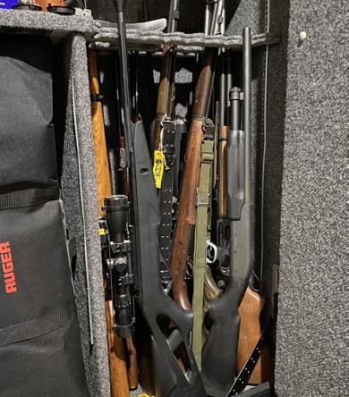 HOUSEHOLD: Refrigerator, gas kitchen range, microwave; washing machine; kitchen table & 2 wood chairs; couch; round table; bedding; dressers; tabletop lamp; wood stove; large gun cabinet; chest of drawers; Alpine water cooler; push lawn mower; queen size air bed.