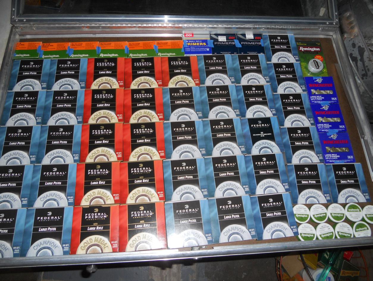 RELOADING AND FIREARM RELATED: Several Reloading Dies, IMR 4247 Powder, IMR Trailboss Powder, Hodgdon Longshot Powder, Alliant Pistol Powder, IMR 4831 Powder, Hercules Pistol Powder, Old Weaver Scopes, Speer 530 Round Ball Bullets, Speer 44 Cal. Bullets, 45 Auto Ammo, 44 Rem. Mag Bullets, 22-250 Ammo, Speer 45 Cal Bullets, Remington #9 ½ Magnum Rifle Primers, Remington # 9 ½ Large Rifle Primers, CCI 400 Small Rifle Primers, Federal Large Pistol Primers, CCI 200 Large Rifle Primers, Federal Premium Match Large Rifle Primers, Federal Small Rifle Primers, Remington #11 Percussion Caps, Winchester WLR Large Rifle Primers, Lyman Tumbler Medium, 35 Whelen Ammo, 45-70 Ammo, 45 M1911 Ammo, Redfield Scope Parts, Scope Rings, Hornady Lock-n-Load Speed Sabots, 70 Win. Brass, Leupold Rem. 700 RH-SA, Bull Barrell De-Resonator, Leupold Compass w/ Case, Powder Horn, RCBS Bullet Puller, Shotgun Chokes, Weaver Top Mount Base, Model 8-81 Remington Side Mount, Colt 300 Win Mag. Clips, Grips for Colt Pistol, Hoppers Black Powder Solvent, 30-06 Brass, 270 Brass, 308 Brass, 3-4- Krag Ammo, Parts for a Thompson, 4 Barrells for Double Barrell Shotguns, Lyman Media Tumber, Lyman Ingot Mold, 44 Cal. Unprimed Brass, New Recoil Pads, 125+ Rounds Steel Ammo, Remington 38 Long Colt Ammo, 12 Ga. Ammo, 7.62 Ammo, Winchester 32 S&W Ammo, Peters 32 S&W Ammo, Federal 327 Mag Ammo, 7.62 Nygant, 44 S&W Russian Ammo, Peters Police Match 32 S&W Long Ammo, Bricks of 22 Ammo, Shooting Chrony, Herters Press, RCBS Reloading Scale, Lee Powder Measure Kit, Lee Sizing Kit, Lee Reloading Press, Lots of other misc. firearm and reloading related items.