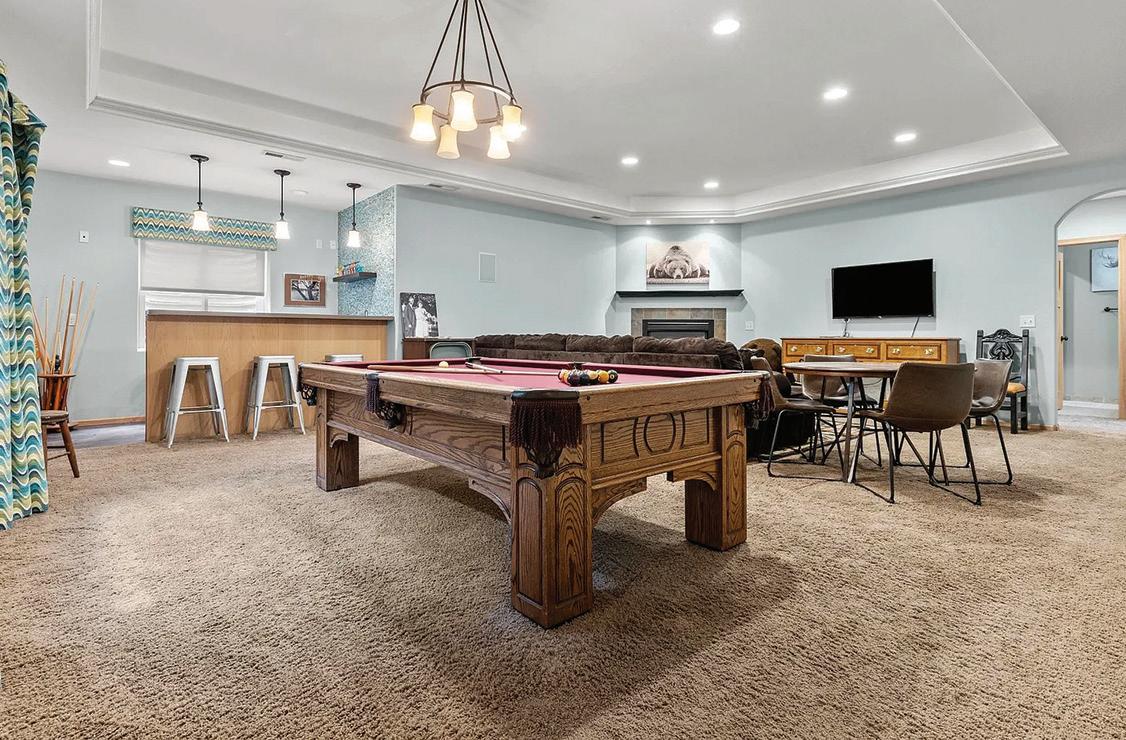 • The lower level family room with a slate gas fireplace is large with an abundance of windows and views of the gaming area and the wet bar area nearby!