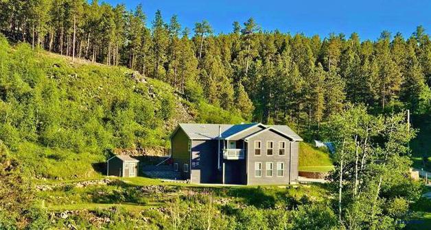 Centrally located between historic Deadwood, SD and Legendary Sturgis, SD this custom home placed on oak and pine covered 3.47 acre lot offers modern amenities while incorporating the rich history of the area. Upon entry take notice of the repurposed beams and bolts resourced from Homestake Gold mine. The living area is spacious with massive windows, high vaulted ceilings, two sided stone fireplace, and gorgeous views from all windows. A well appointed kitchen with plenty of counter space, cabinets and a one-of-kind custom island with with seating awaits. Take notice of the repurposed iron-ore shaft range hood and the hidden walk-in pantry to the right of the fridge. The large master suite features a walk-in closet, bathroom with double vanity, tiled shower, and private laundry (2nd laundry in basement). The exterior grounds of this home are incredible with built-in firepit, beautiful covered patio with repurposed beams, fully irrigated yard and unmatched privacy backing forest.