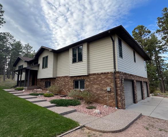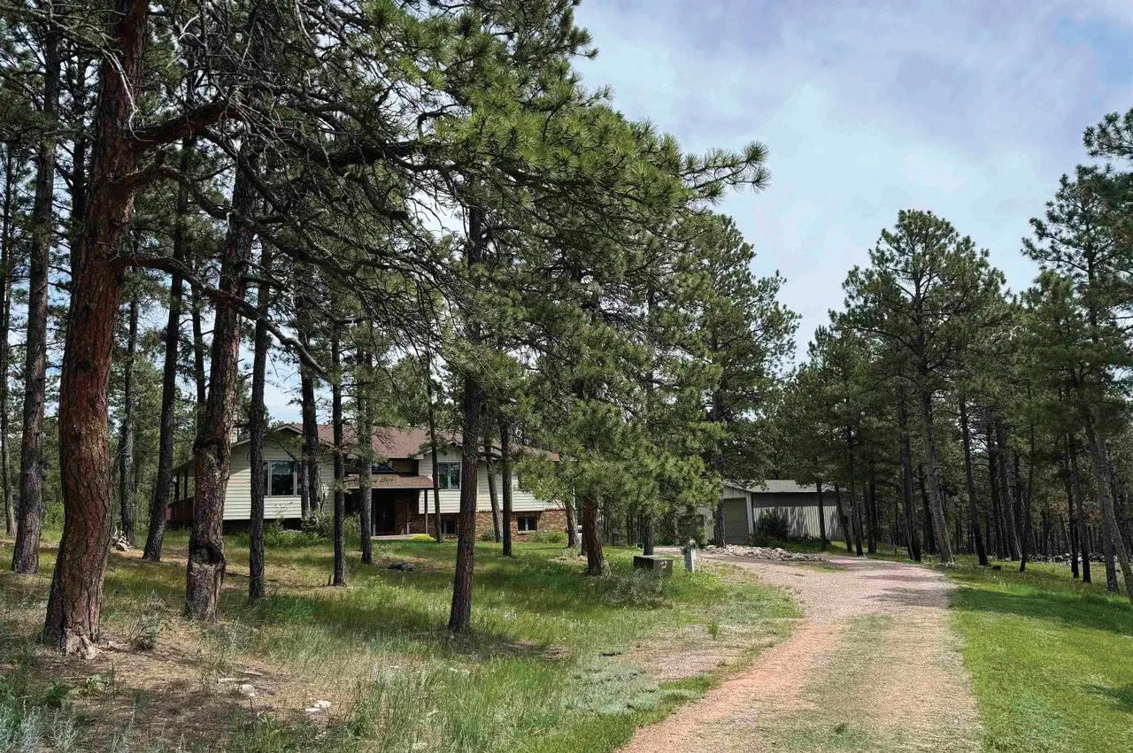 Just south of Rockerville, this serene 13-acre property sits in a quiet, paved development backing directly to US Forest Service land. A curved drive leads to a beautifully maintained home surrounded by manicured landscaping, ideal for nature lovers and horse owners, with two horses allowed. Inside, a welcoming foyer opens to hardwood floors and a spacious, remodeled kitchen with ample storage and workspace, flowing into the dining area and covered deck. The impressive owner’s suite features a walk-in closet and updated bath with double sinks, soaking tub, separate shower, and private toilet room. Two additional bedrooms, a full bath, and laundry complete the main level. The lower level includes another bedroom and bath, bonus room, two gathering spaces, and a cozy wood burner, with access to a cement patio and 3-car garage. A 30’x40’ Morton building with wood burner, cabinetry, and tall overhead door adds versatility. Additional features include geothermal heating and cooling, recirculating hot water, an 85-gallon water heater, multiple decks, and a fenced garden with water hydrant.