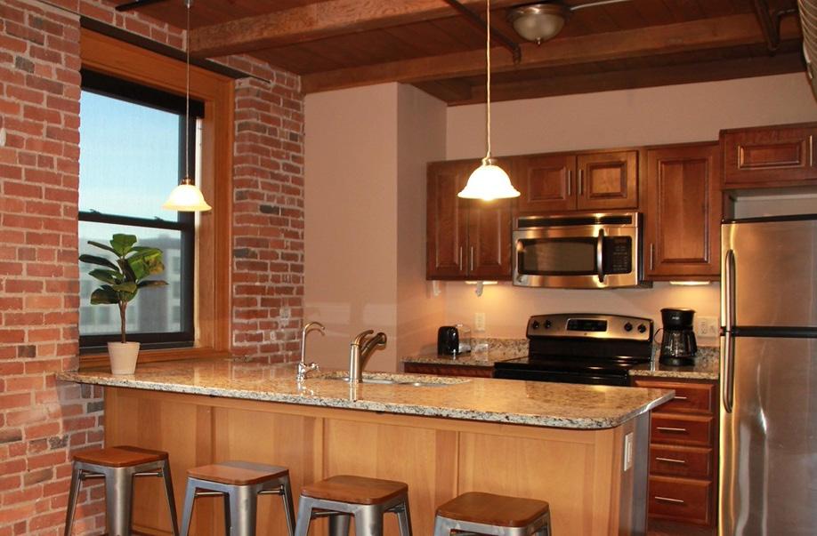 Loft living—one of the hottest interior design and real estate trends! Wood beams, brick walls, concrete, and exposed pipes serve as striking architectural details in this urban loft-style condo, located in the completely renovated Historic United Center in downtown Sioux City. Modern touches like gorgeous Brazilian cherry floors and cabinets, granite counters, and edgy lighting create the perfect blend of old and new. This loft-style condo features an open-concept kitchen and living room that feel bright and airy, with large windows that showcase views of downtown Sioux City.