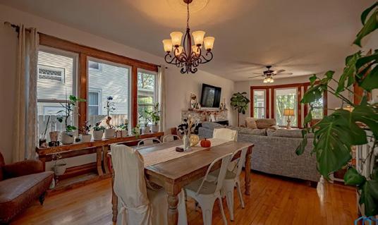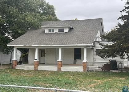 This charming 3+ bedroom, 2 bathroom home combines timeless character with modern updates. Step inside to find an inviting open living and dining area, highlighted by original woodwork and solid doors. The kitchen features updated vinyl flooring, a tile backsplash, stainless stove, dishwasher, and a nice pantry cabinet. The primary bedroom offers an extra sitting area, perfect for a reading nook or home office, while the other two bedrooms are nicely sized. The full bathroom has been updated. Enjoy outdoor living with a cozy front porch, enclosed back porch, and a large fenced backyard with patio.