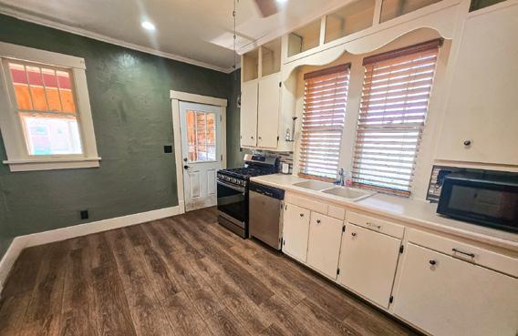 Two-story home with 4 bedrooms, 2 baths, new kitchen, original refinsihed hardwood flooring throughout. Outbuildings include a newer storage shed plus an older detached garage-style shed with lean-to and concrete floor.