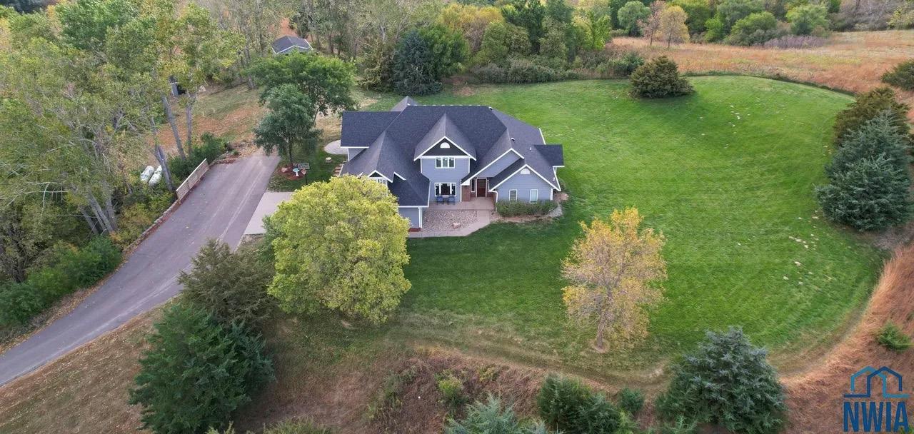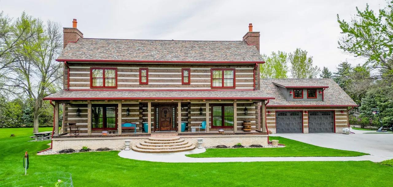 One of a kind, custom built Stone Mill Oregon timber home on 1.16 acres adjacent Dakota Dunes. 20’ vaulted ceiling, 5 fireplaces, primary suite on main, hickory & tile floors, Rumsford fp with Chiefcliff stone, covered front porch.