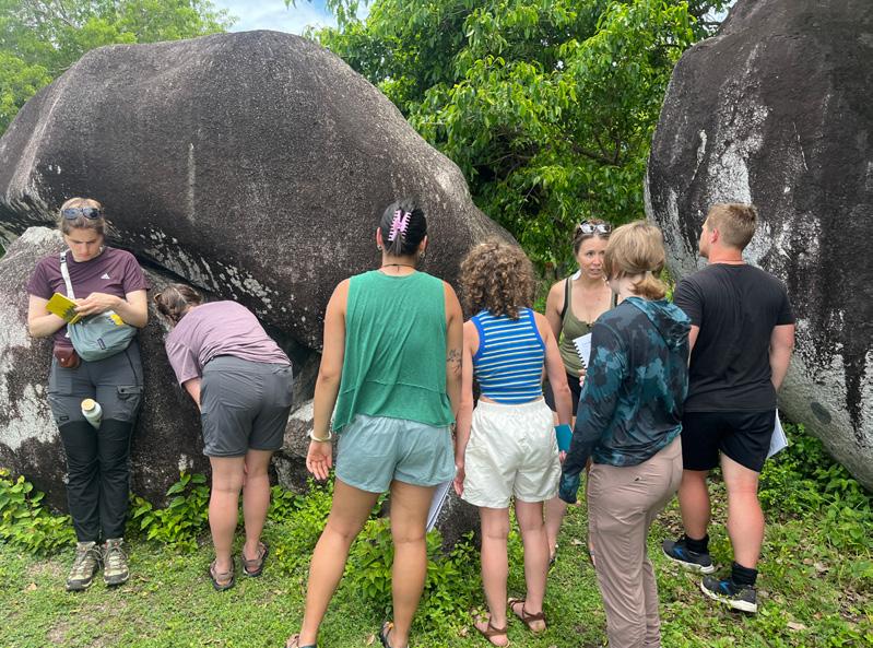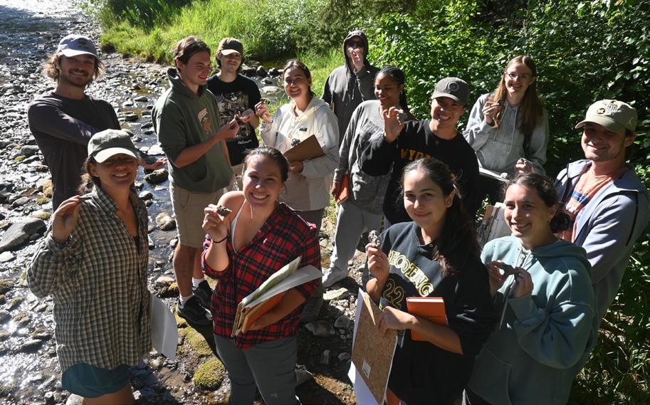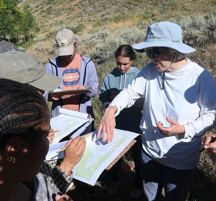 the owner of Brunton, Inc. Lauren brought a dozen state-of-the-art Brunton Axis geological transits to Camp Davis, taught the students how to use them, and let our students keep them for the duration of the course. Opposite page: 1 - Earth 450 students mapping the Camp Davis outcrop along Highway 191 with professor Becky Lange. 2 - Earth 202 students spent time in the field exploring water chemistry in the streams and lakes around Camp Davis as part of a project to understand the relationship between water chemistry and quality and catchment geology. The Apera water meters were purchased with alumni support through our Giving Tuesday drive. 3 - Students enjoying a night off from homework. 4 - Earth 450 students using flow meters and YSI water probes (purchased with alumni Giving Tuesday support!) to analyze stream flow and water chemistry along the Hoback River, from its headwaters to its junction with the Snake River. Water chemistry is impacted by bedrock geology, wildfire history, and sediment supply.
