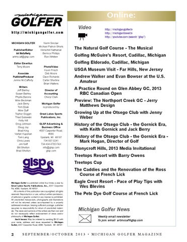 Photo/Video Kevin Frisch Deb Moore Dave Richards Carter Sherline Brian Walters Director of Accounting Cheryl Clark Michigan Golfer is produced by Great Lakes Sports Publications, Inc. GLSP Advertising & Business Office 4007 Carpenter Road, #366 Ypsilanti, MI 48197 734.507.0241 734.434.4765 FAX info@glsp.com glsp.com