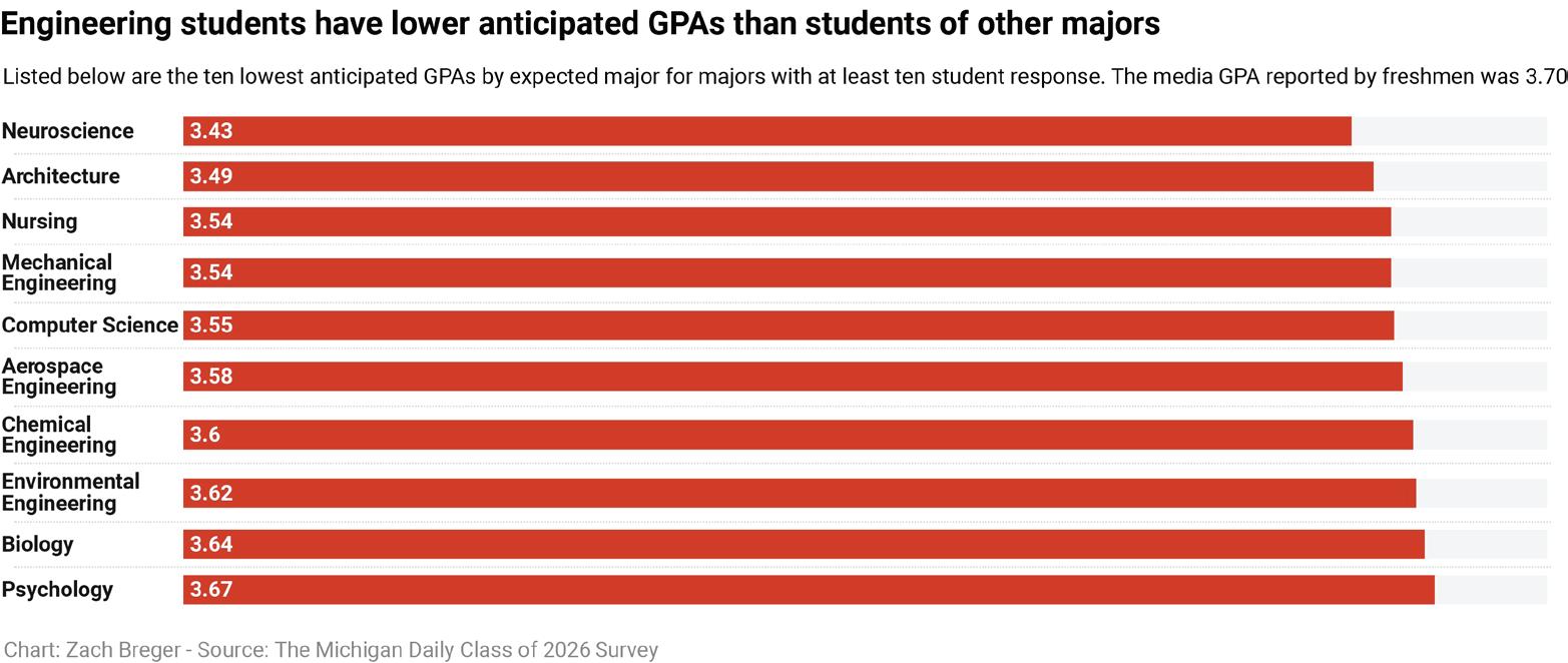 Out of the 10 majors with the lowest expected grades, half of them are in the College of Engineering. Mechanical engineering, computer science, aerospace engineering, chemical engineering and environmental engineering students all think they will end up with a GPA lower than 3.70 — the median GPA anticipated by the class of 2026.